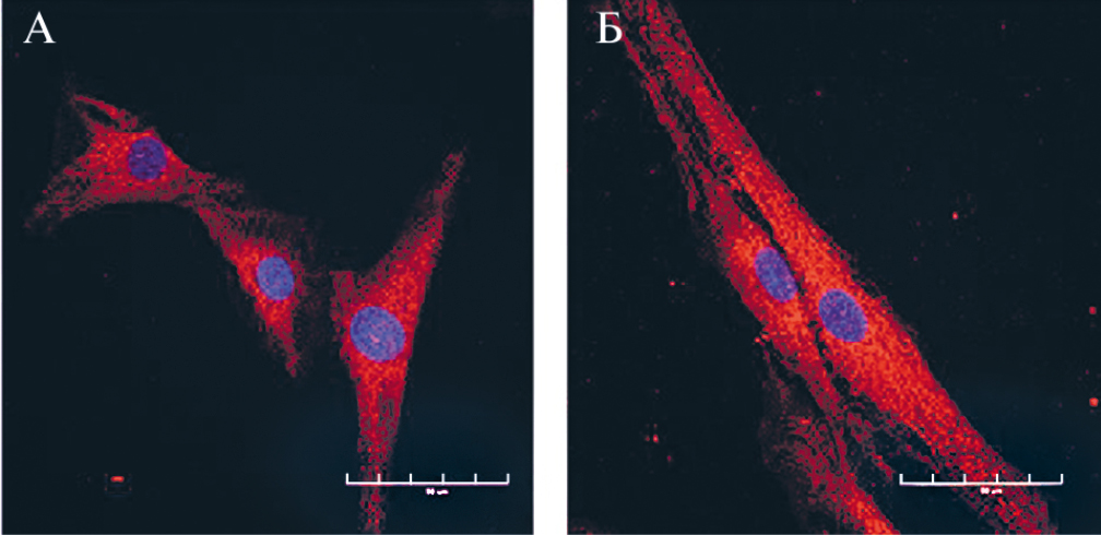 Клетки из фрагмента биоптата кожи выделяли механическим способом и культивировали в среде, содержащей 90 % DMEM/F12 (Биолот, Россия) + 10 % эмбриональной бычьей сыворотки (Gibco, США). Клетки пересевали с использованием раствора трипсина (0,25 %) – Версена (0,2 %) по достижению ими 90 % конфлюэнтности. Кратность рассева составляла 1:3–1:5. Клетки активно пролиферировали, их жизнеспособность после криоконсервации составляла 80 %. В качестве контроля использовали дермальные фибробласты линии DF1, полученные от здорового донора – женщины 37 лет (клетки были получены из ЦКП Коллекции культур клеток позвоночных Института цитологии РАН).