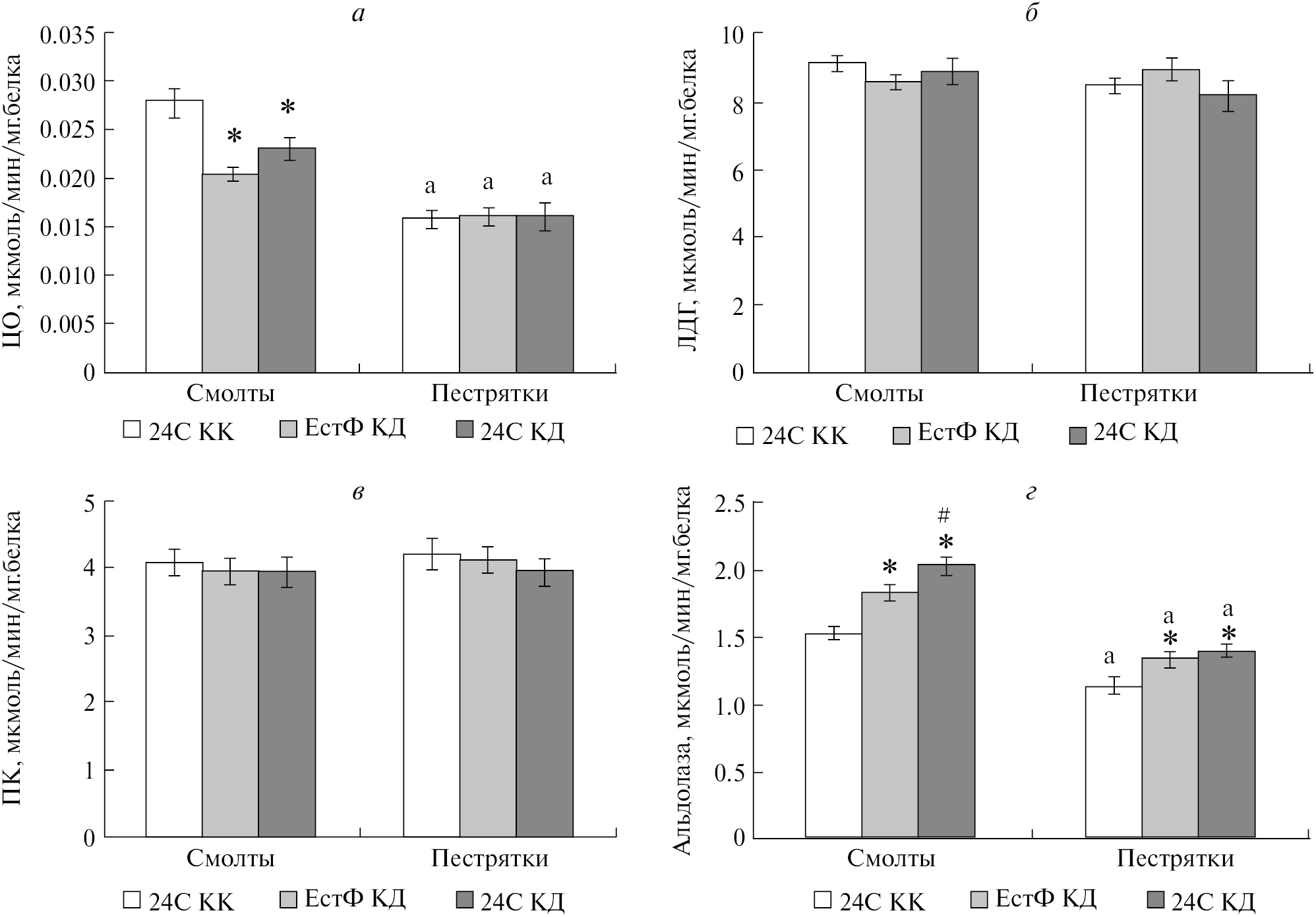 Рис. 1. Активность ферментов ЦО (a), ЛДГ (б), ПК (в), альдолазы (г) (мкмоль/мин/мг белка) в белых мышцах атлантического лосося, выращиваемого в группах с разными режимами освещения и кормления («24С КК» – режим освещения постоянный, кормление круглосуточное; «ЕстФ КД” – естественный фотопериод, кормление в светлое время суток; «24С КД» – режим освещения постоянный, кормление в светлое время суток). Различия достоверны при p < 0.05: * – в сравнении с группой «24С КК», # – в сравнении с группой «ЕстФ КД», a – между смолтами и пестрятками в соответствующей группе.