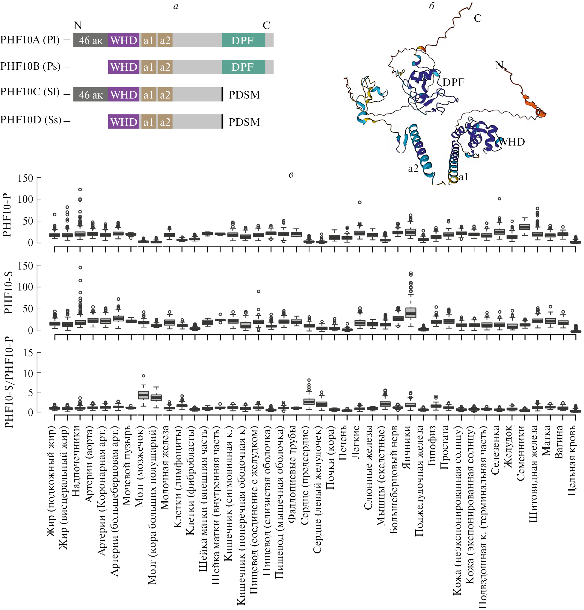 Рис. 1. (а) Схема изоформ PHF10. Обозначены характерные домены и мотивы изоформ PHF10. (б) Предсказанная структура PHF10-Pl (Q8WUB8) согласно Alpha Fold database (https://alphafold.ebi.ac.uk/entry/Q8WUB8). (в) Экспрессия изоформ PHF10-P, PHF10-S и их соотношение в различных тканях человека согласно базе данных GTEx (The Genotype-Tissue Expression (GTEx) Project data). По оси ординат TPM (количество транскриптов на миллион прочтений в образце).