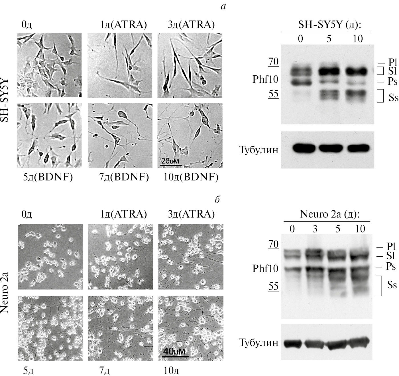 Рис. 2. (а) и (б) Нейрональная дифференцировка клеток человека линии SH-SY5Y (А) и клеток мыши линии Neuro 2a (б): левая панель – визуализация с помощью негативного контрастирования фенотипа клеток в течение десяти дней дифференцировки; правая панель – Вестерн-блоттинг изоформ PHF10 без дифференцировки, в середине и по окончании дифференцировки. Изоформы обозначены справа. Слева показан маркер молекулярных масс – 55 и 70кДа. Окраска антителами к тубулину использовалась как контроль нанесения в обоих случаях.