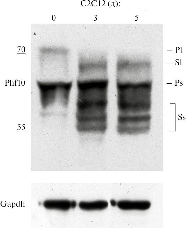 Также была проведена дифференцировка линии иммортализованных мышиных скелетных миобластов C2C12 по мышечному пути с помощью замены в клеточной среде 20 % бычьей сыворотки на 1 % лошадиную сыворотку [15]. Методом Вестерн-блоттинга уже на третий и на пятый дни дифференцировки были обнаружены изменения уровней экспрессии изоформ Phf10. Баланс изоформ смещался в сторону изоформ, не содержащих DPF: прекращалась экспрессия Phf10-Pl, а уровень Phf10-Ss и Phf10-Sl изоформ возрастал (рис. 3).
