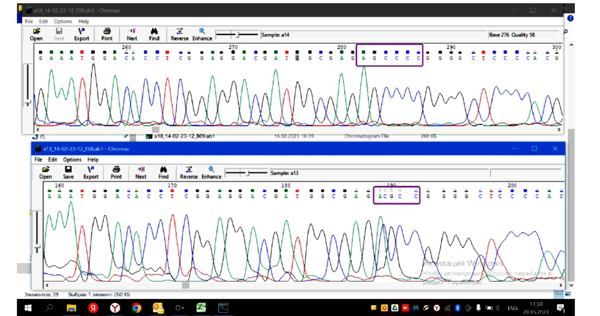 После получения однородных и чистых ПЦР продуктов, ампликоны передавались в компанию ООО “Синтол” для секвенирования. Полученные хроматограммы сиквенса проанализированы программой Chromas (https://technelysium.com.au/wp/chromas/), выравнивание и сравнение последовательностей выполнено программой ClustelW (https://www.genome.jp/tools-bin/clustalw). Выявленные полиморфизмы верифицированы в ручном режиме при помощи анализа хроматограмм сиквенса.