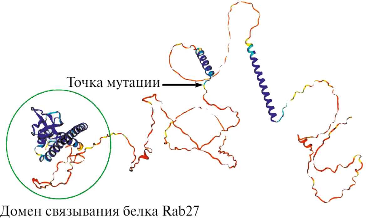 Выполнено 3D моделирование структур форм MLPH дикого и мутантного типов при помощи программы для построения трехмерных моделей (https://swissmodel.expasy.org), результаты которого представлены на рис. 3 и 4.