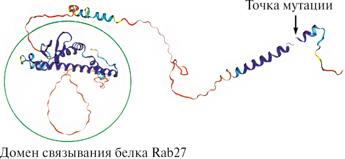 Белок MLPH имеет 3 функциональных домена: N-участок содержит домен, связывающийся с белком Rab27А, который, в свою очередь, взаимодействует с меланосомами. Центральный участок связывается с моторным протеином MyoVa, С-концевой участок взаимодействует с актином при доставке меланосом к дендритам меланоцитов [17]. Обнаруженная мутация находится в аминокислотной позиции 327, а измененная последовательность длится до аминокислоты номер 372 и затем обрывается. Мутантный белок полностью теряет С концевой домен связывания c актином, а также имеет измененный домен связывания с миозиновым белком MyoVa.