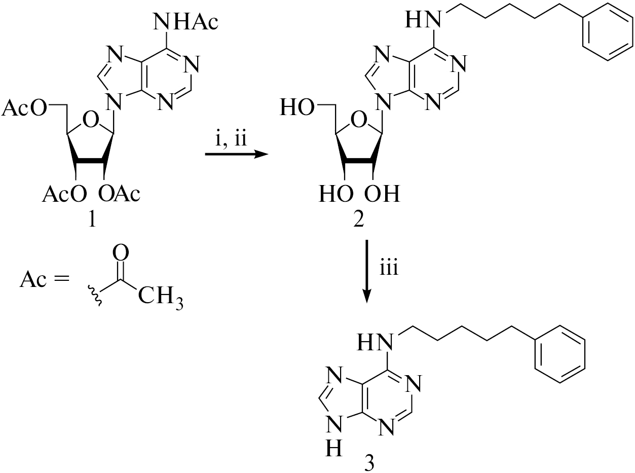Рис. 1. Синтез N6-(5-фенилпентан‑1-ил)аденина. Реагенты и условия: i. R-OH, Ph3P, DIAD, THF, 20 °C, 48 ч; ii. 5М PrNH2/MeOH, 20 °C, 24 ч; iii. HCl, 100 °C, 3 ч.