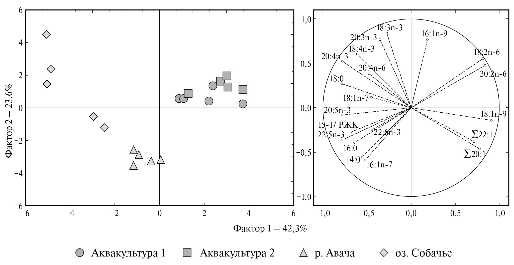 Годовики и двухлетки арктического гольца были отобраны из двух аквакультурных хозяйств, которые осуществляют экспериментальное выращивание одной и той же исходной формы. Дикие особи молоди арктического гольца отбирались в оз. Собачье (Норило-Пясинская система, Красноярский край), откуда ранее был получен рыбопосадочный материал для экспериментальной аквакультуры. Кроме того, была отловлена молодь проходной формы гольца (мальмы) Salvelinus malma [Walbaum, 1792] из р. Авача (Камчатский край). Возраст особей из природных экосистем составлял от 0+ до 2, и аквакультуры – от 1+ до 3+. Для анализа отбирали мышечную ткань (0.5-1.0 г) со спинной стороны молоди гольцов. Липиды из тканей экстрагировали методом Фолча с модификациями. Этапы подготовки проб и анализа ЖК методом хромато-масс-спектрометрии были описаны ранее [2]. Расчеты средних значений и стандартных ошибок, дисперсионный анализ и анализ главных компонент выполнены с использованием пакета Statistica 9.0 (StatSoft Inc.).
