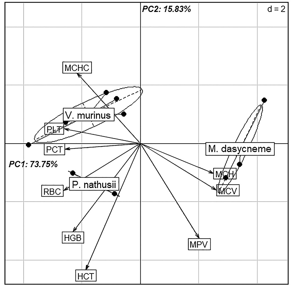 На рис. 1. представлены три самостоятельные группы рукокрылых: мигрирующие виды V. murinus, P. nathusii и оседлый вид M. dasycneme. Анализ главных компонент показал, что 73.75% общей дисперсии параметров красной крови приходится на первую главную компоненту и 15.83% – на вторую главную компоненту. Наибольший вклад в межвидовую изменчивость показателей красной крови по РС1 вносят эритроциты (13.66%), средний объем эритроцита (13.22%), тромбоциты (13.42%), тромбокрит (13.07%), среднее содержание гемоглобина (12.27%).