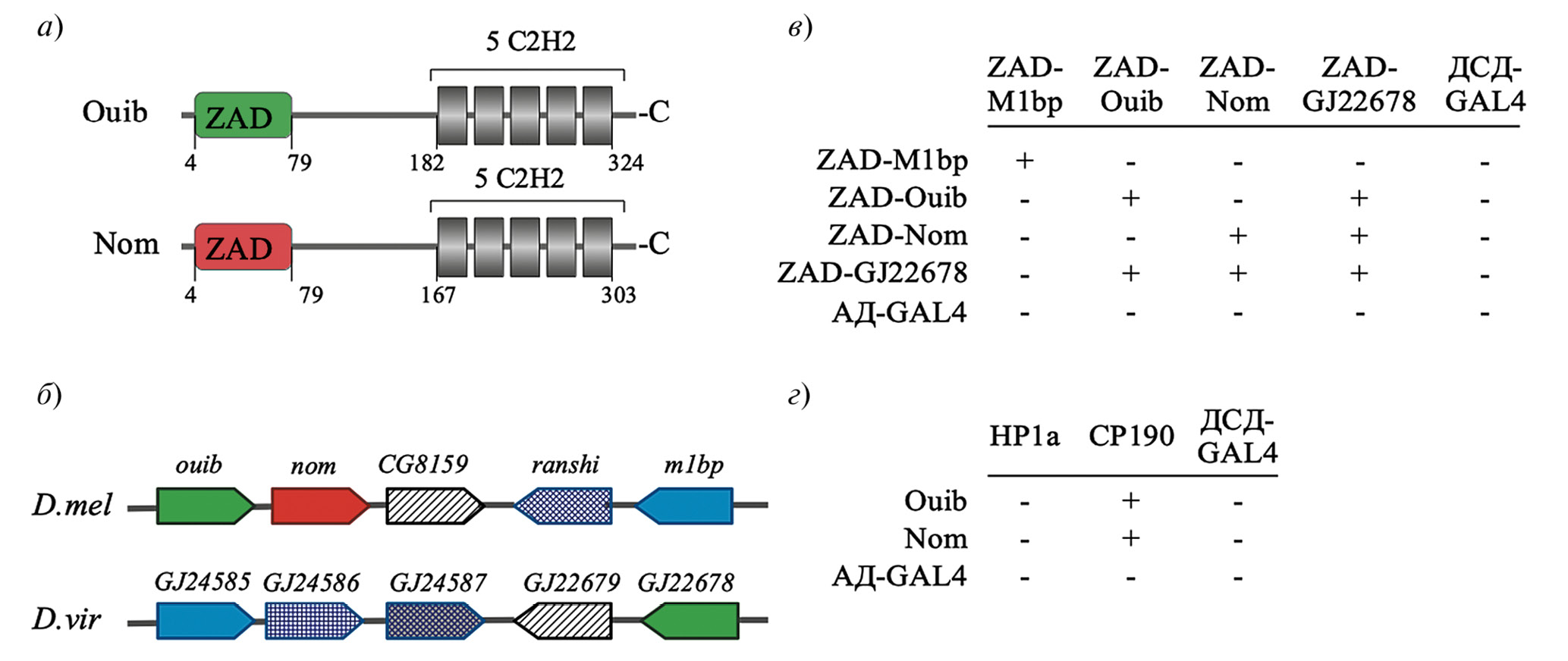 Рис. 1. Доменная структура белков ouib и nom. Указаны порядковые номера аминокислотных остатков, соответствующих границам доменов (а); геномное расположение генов m1bp, ouib и nom в кластере у D. melanogaster и D. virilis. Для обозначения ортологов использованы одинаковые цвета (б); исследование взаимодействия между ZAD-доменами в ДДС. Фрагменты ZAD были слиты с ДНК-связывающим доменом GAL4 (ДСД), и исследовано их взаимодействие с фрагментами, слитым с активационным доменом GAL4 (АД). Результаты представлены в колонках, где + и – означают наличие или отсутствие взаимодействия соответственно. В качестве положительного контроля проверялась способность ZAD-доменов к димеризации, а в качестве отрицательного контроля выполнялось тестирование на наличие взаимодействия только с активационным (АД) или ДНК-связывающим (ДСД) доменом белка GAL4 (в); исследование взаимодействия полноразмерных белков Ouib и Nom, слитых с АД GAL4, с полноразмерными белками СР190 и HP1a, слитыми с ДСД GAL4 (г). Остальные обозначения – такие же, как в (в).