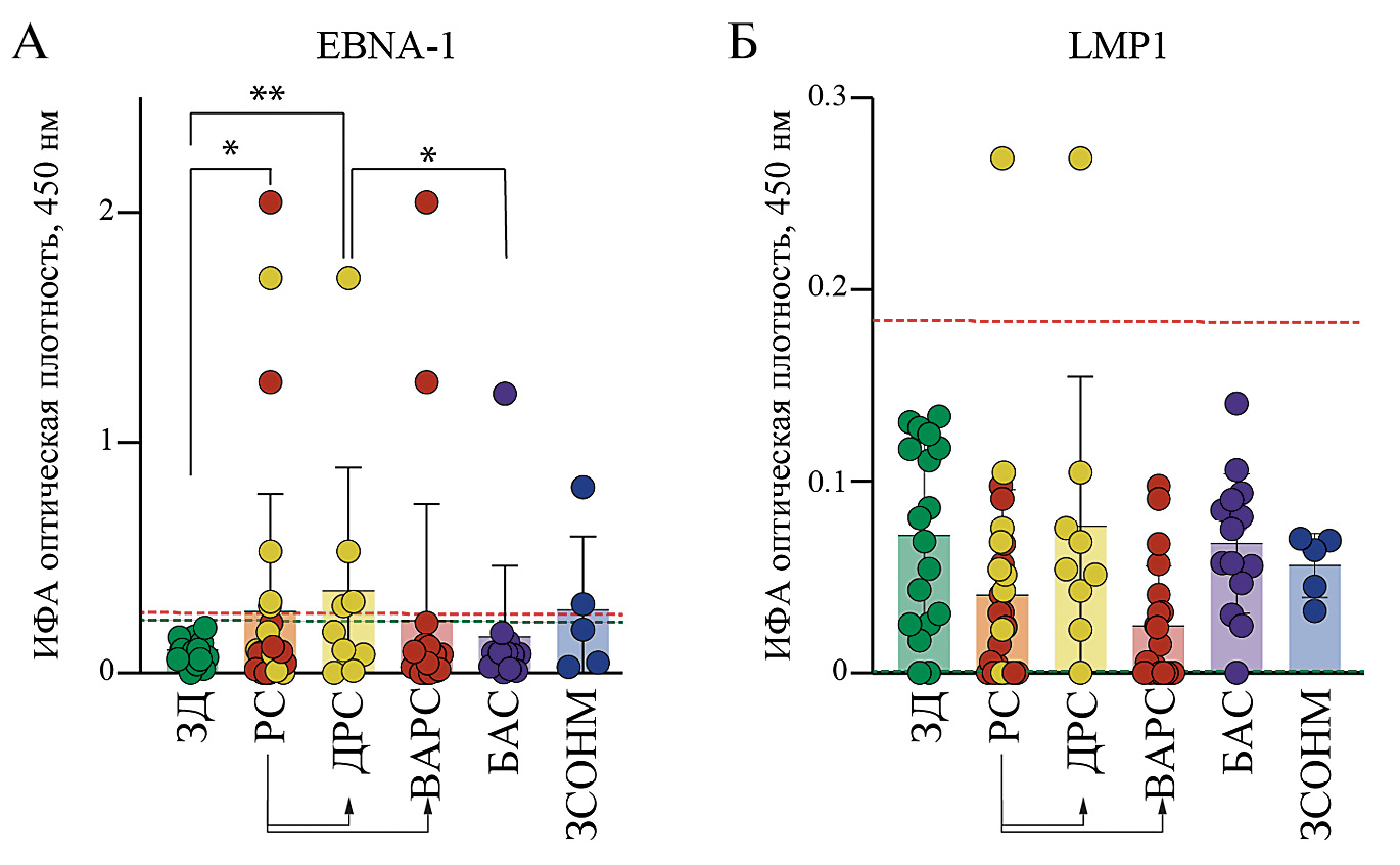Определение уровня антительного ответа проводилось с использованием химически синтезированного пептида EBNA-1 (386–405 а.о. – SQSSSSGSPPRRPPPGRRPF) с чистотой >90%, что позволяет избежать ложно-положительного сигнала от связывания неспецифичными антителами сыворотки побочных продуктов, часто образующихся при прокариотической экспрессии белков. Пептид наносился на дно лунки сорбирующей плашки в концентрации 1 мкг/мл в карбонатном буфере (pH = 9.0), инкубация длилась 16 ч при +4 °С. Затем оставшиеся места связывания на дне лунки блокировались раствором 2% сухого обезжиренного молока в карбонатном буфере (pH = 9.0) в течение 1 ч при помешивании, 37 °С. Сыворотка крови разводилась в 100 раз в конъюгатном буфере (фосфатно-солевой буфер (pH = 7.4), 0.05% “Твин-20”, 0.5% сухого обезжиренного молока). После инкубации при комнатной температуре в течение 1 ч при помешивании, плашки отмывались 5 раз буфером для отмывки (фосфатно-солевой буфер (pH = 7.4), 0.1% “Твин-20”). Связавшиеся антитела детектировались вторичными антителами к F(ab′)2 фрагменту антител человека класса IgG, конъюгированными с пероксидазой хрена (Sigma-Aldrich, A2290). После инкубации со вторичными антителами проводили 6 циклов отмывки с последующим добавлением 3, 3’, 5, 5’-тетраметилбензидина гидрохлорида (ТМБ), который служит субстратом для пероксидазы хрена. Реакцию останавливали добавлением раствора 10%-ной серной кислоты. Регистрация сигнала связывания осуществлялась с использованием плашечного многофункционального анализатора Varioskan LUX при длине волны 450 нм. Для статистической обработки результатов использовали программное обеспечение GraphPad Prism, версия 9.