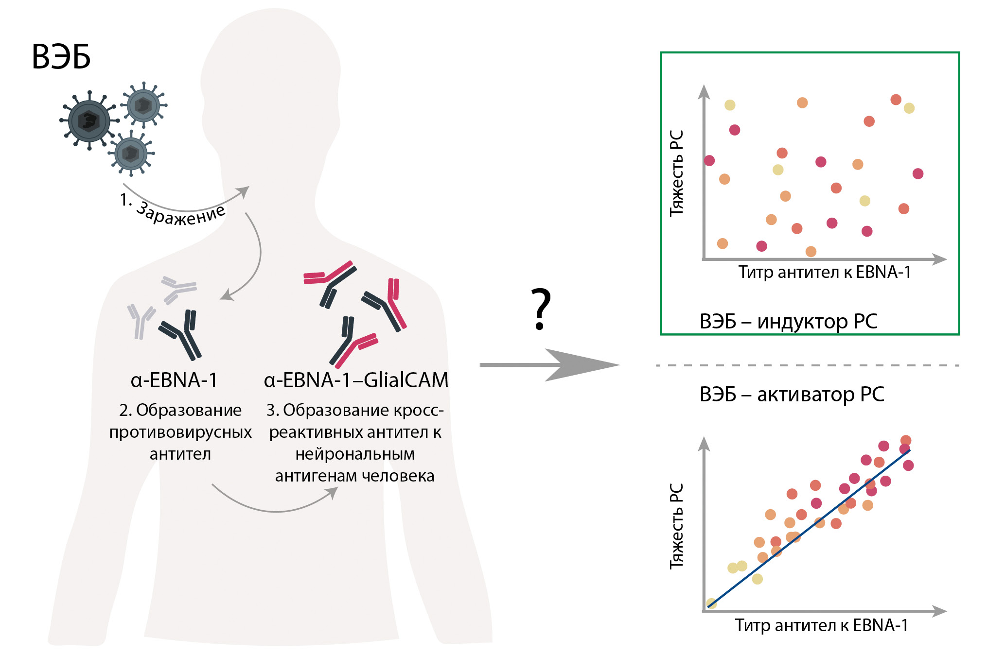 Рис. 2. Предполагаемая схема участия вируса Эпштейна – Барр в развитии рассеянного склероза. 1. Вирус проникает в организм человека и заражает Б-клетки. 2. Происходит накопление вирусных антигенов (например, EBNA-1, VCA и др.) и образование противовирусных антител к данным антигенам. 3. Образовавшиеся противовирусные иммуноглобулины в процессе созревания и соматической гипермутации становятся кросс-реактивными к нейрональным антигенам человека. ВЭБ – вирус Эпштейна – Барр, РС – рассеянный склероз.