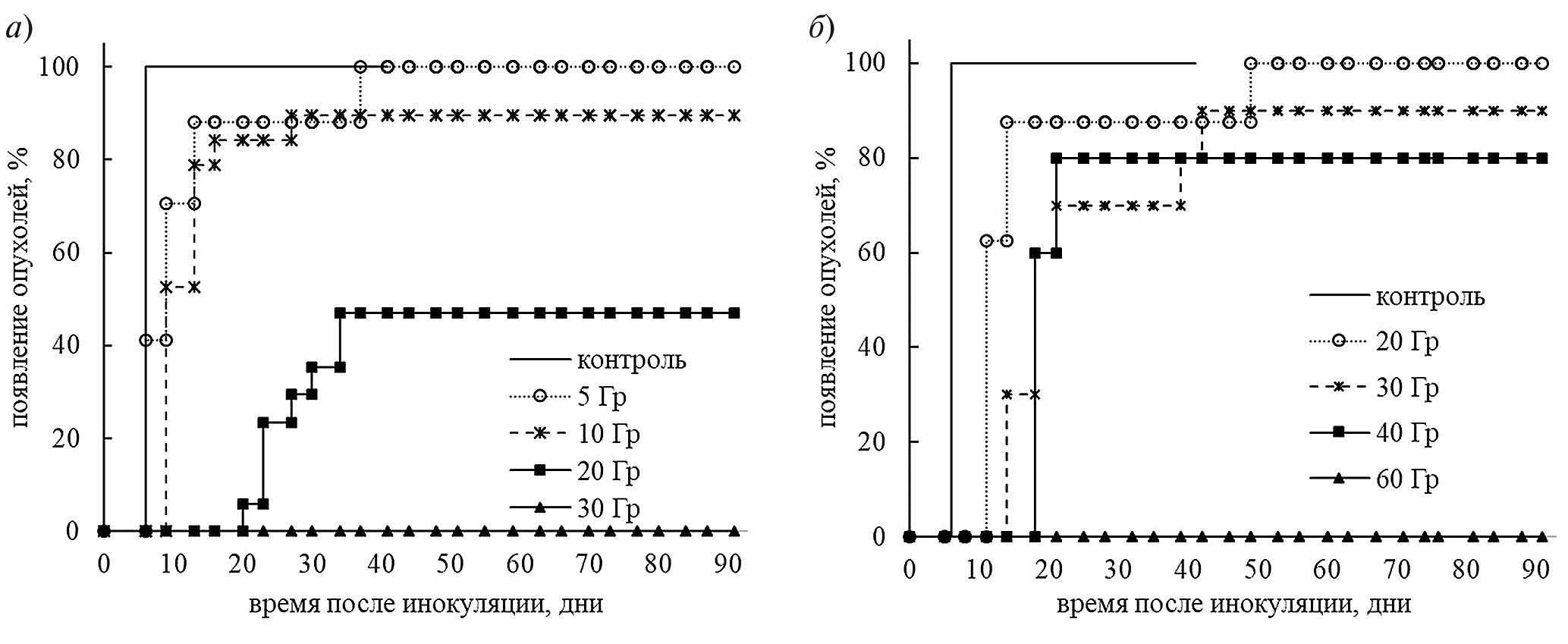 Рис. 1. Динамика появления опухолей у мышей после инокуляции клеток АКЭ, облученных: (a) ионами углерода в диапазоне доз 5–30 Гр; (б) РИ в дозах 20–60 Гр.