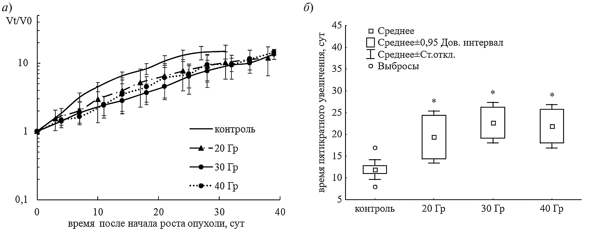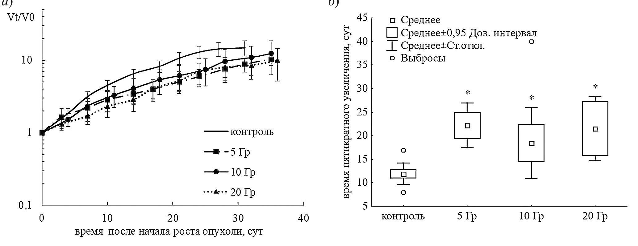 Рис. 3. Динамика роста опухолей у мышей после инокуляции суспензии клеток АКЭ облученных РИ: (а) средние относительные объемы опухоли в зависимости от дней после появления опухоли; (б) данные рисунка (a) представлены в виде количества дней для увеличения объема опухоли в пять раз по сравнению с первым измеренным объемом. Объемы нормализованы к первому измеренному объему ≥0.40 cм3. Статистическая значимость от контрольной группы оценивалась с помощью U-критерия Манна – Уитни (* р ≤ 0.01).