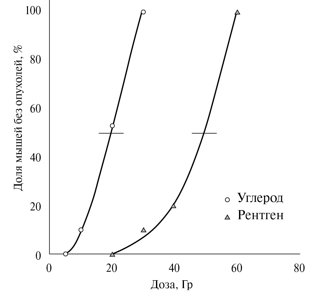 Таким образом, было обнаружено, что после облучения суспензии клеток АКЭ ex vivo ионами углерода в дозе 30 Гр и 60 Гр РИ солидные опухоли у мышей не появлялись в течение всего времени наблюдения. Показано, что динамика появления опухолей после облучения клеток АКЭ ex vivo 12С и РИ зависела от дозы. Величина латентного периода, как при облучении клеток 12С, так и РИ, увеличивалась с ростом дозы. Скорость роста опухолей после облучения клеток АКЭ ex vivo не зависела ни от дозы, ни от вида излучения, но значительно отличалась от контроля. Величина ОБЭ, определенная по равноэффективной дозе вероятности индукции опухолей у 50% мышей в течение 90 сут, составила 2.59, что свидетельствует о высокой противоопухолевой эффективности исследуемого пучка ионов углерода.