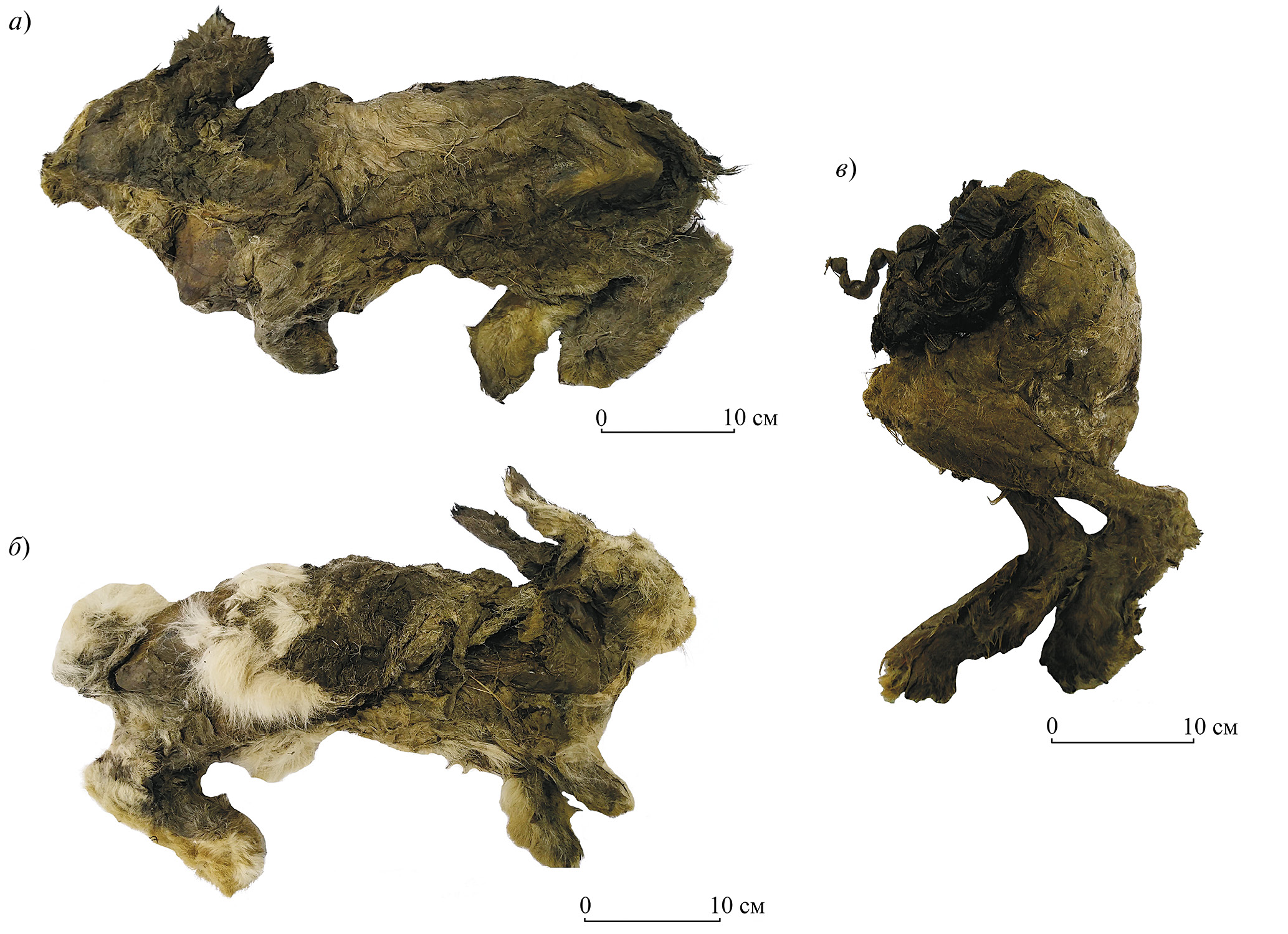 Рис. 1. Мумии донских зайцев с местонахождения Юнюген: a – № Yn-2/16; б – Yn-3/16; в – MM-F29.