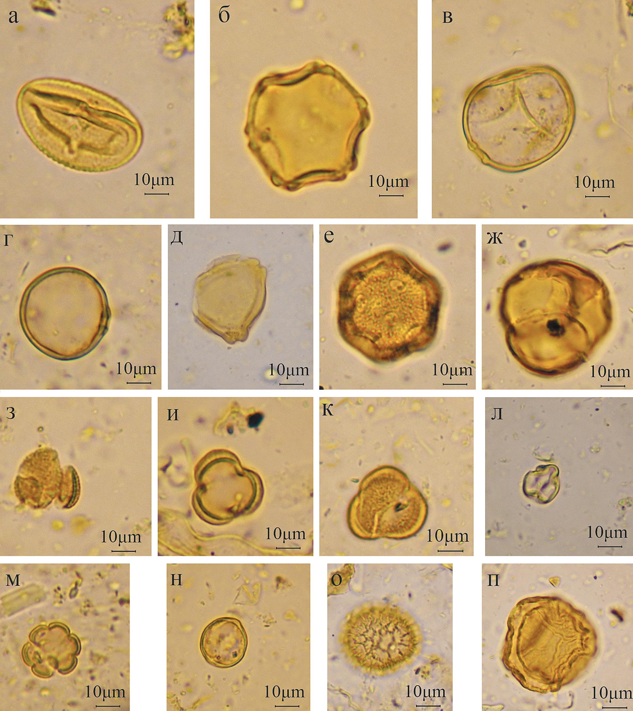 Рис. 2. Фотографии некоторой пыльцы растений и спор в пробах донских зайцев, местонахождение Юнюген: а – Salix, б – Alnus, в, г – Poaceae, д – Betula sect. Fruticosa, е – Caryophyllaceae, ж – Ericales, з – Brassicaceae, и, к – Artemisia, л – Rosaceae, м – Sanguisorba, н – Polygonaceae, о – Lycopodium pungens, п – Selaginella rupestris.