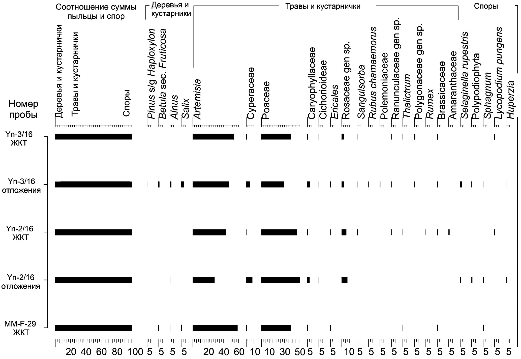 Спектры вмещающих отложений также включают пыльцевые зерна степных и лугово-степных сообществ, но процентное содержание их выше. Доминирует пыльца Rosaceae gen. sp. до 7.5%, Caryophyllaceae 2.6–3.3%, Cyperaceae 4.7–7.8%. Присутствуют синюховые Polemoniaceae, Poligonaceae gen. sp., Brassicaceae, кустарнички – морошка обыкновенная Rubus chamaemorus и Ericales. Содержание древесно-кустарниковых растений (Betula sect. Fruticosa, Alnus, Salix) в сравнении с образцами зайцев больше и составляет до 6.7% (проба № Yn-3/16_отложения). Отмечена единичная пыльца Pinus s/g Haploxylon, возможно, кедрового стланика Pinus pumila. Споры (Selaginella rupestris, Sphagnum, Polypodiophyta) составляют до 2.6%.