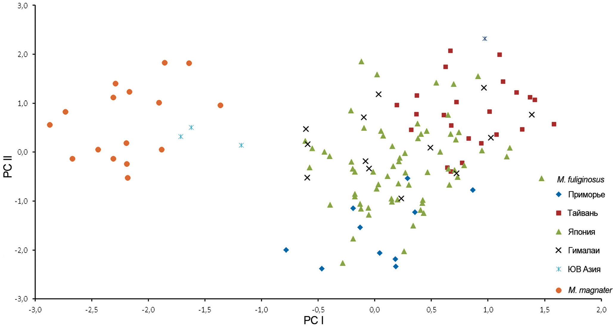 PC-анализ показывает неплохое разделение M. fuliginosus и M. magnater по первому фактору (рис. 3). Сумма значений общей изменчивости первых двух факторов превышает 79%. На ненормализованных данных первый фактор скоррелирован с большинством размерных параметров, на нормализованных (varimax normalized) – в первую очередь, с длинами зубных рядов. Почти все экземпляры M. fuliginosus образуют единое облако. Размещение географических выборок в нем неравномерно, часть их не перекрывают друг а по одному или двум факторам, что свидетельствует о наличии определенной географической изменчивости, нуждающейся в дальнейшем изучении. Выборка M. magnater хорошо обособлена, и экземпляры из провинции Каобанг определенно тяготеют к ней, а не к M. fuliginosus.