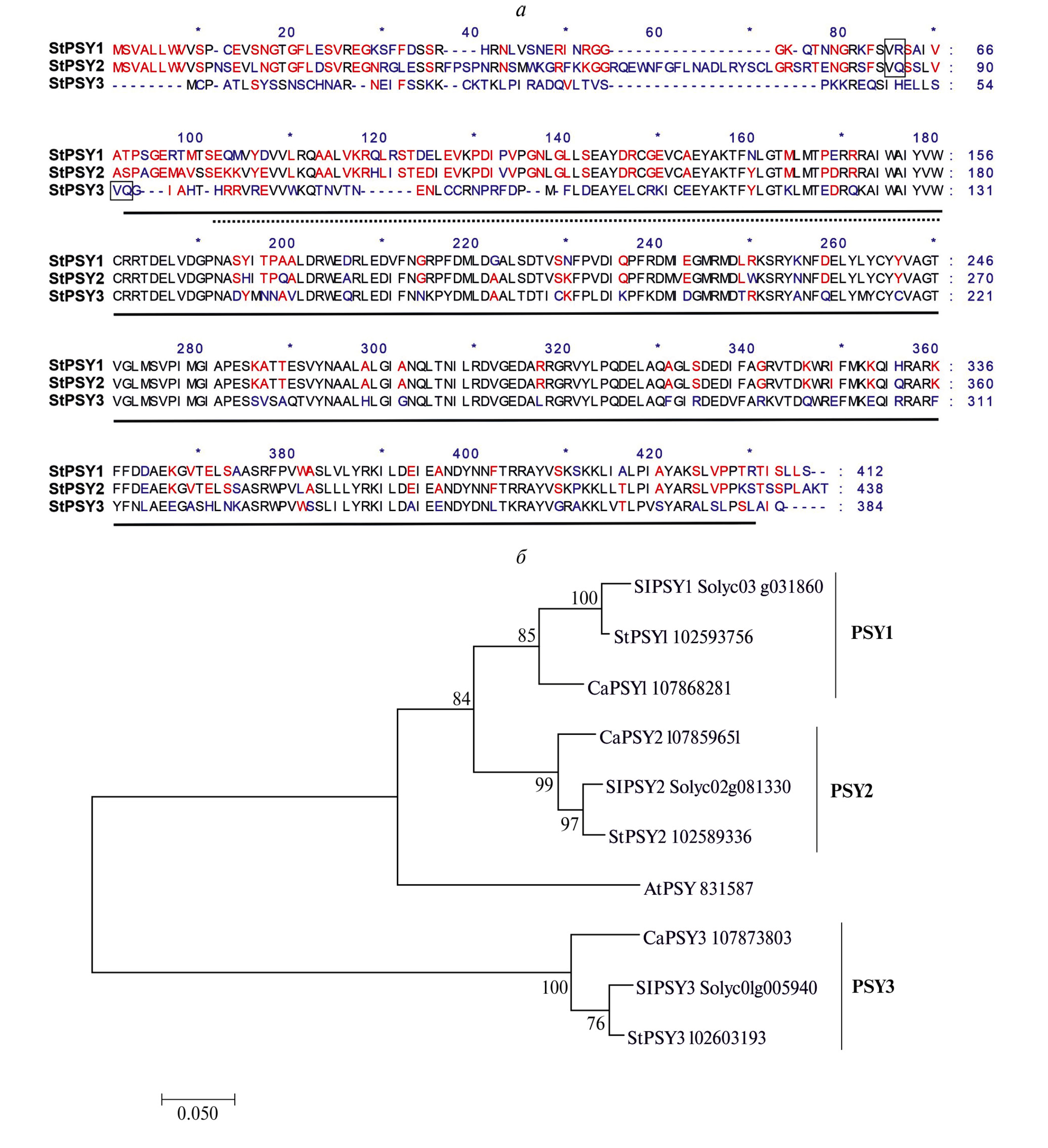 Филогенетический анализ, проведенный с использованием гомологичных белков из других видов растений, позволил построить дендрограмму, где четко прослеживается формирование гомологами PSY1 и PSY2 видов Пасленовых отдельных кластеров, сестринскую ветвь к которым образует единственный белок PSY A. thaliana (рис. 1б). При этом гомологи PSY3 формируют отдельный кластер, занимая базовую позицию в дендрограмме (рис. 1б).