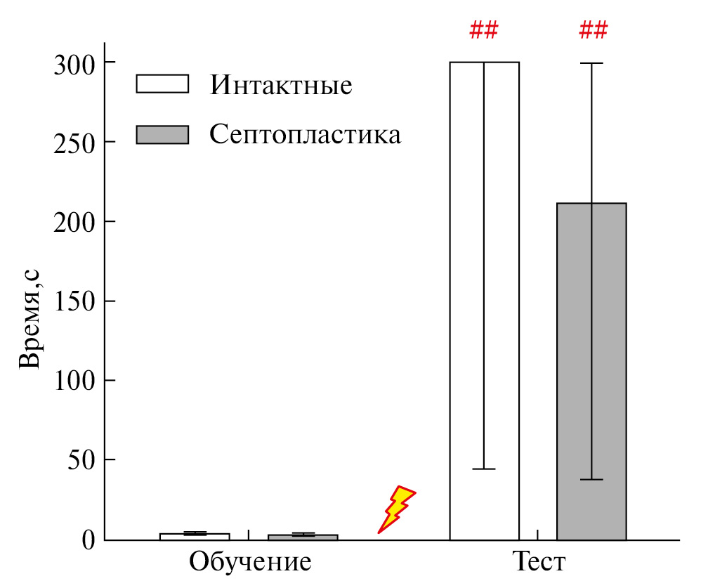 Контрольные и опытные крысы, помещенные в центральный отсек до удара током, быстро переходили в один из темных отсеков, что отразилось в одинаково коротких ЛП соответствующей реакции (рис. 1). Удар током крыс контрольной и опытной групп привел к многократному росту ЛП ухода из центрального отсека, в среднем увеличившись в 100 и 60 раз соответственно. Согласно классическим представлениям [8], увеличение ЛП этой реакции свидетельствует о формировании следа памяти об ударе током в темном отсеке, позволяющем избегать захода в него при повторном помещении в установку и оставаться в освещенном отсеке.