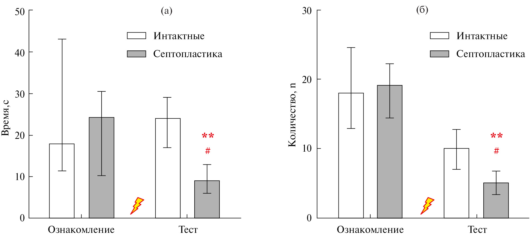 При тестировании УРПИ у опытных крыс, как это следует из рис. 2, обнаружены уменьшение времени обследования входов в темные отсеки и числа стоек относительно как исходных, так и контрольных значений. Это свидетельствует об уменьшении исследовательской активности у крыс под влиянием септопластики. Кроме того, выявлены значимые различия (p = 0.004) во времени реакции замирания: у крыс опытной группы оно составило 19.1 (12.1–41.9) с, а контрольной 2.8 (0–8.2) с, что свидетельствует о повышенном уровне тревожности у опытных животных в условиях УРПИ.