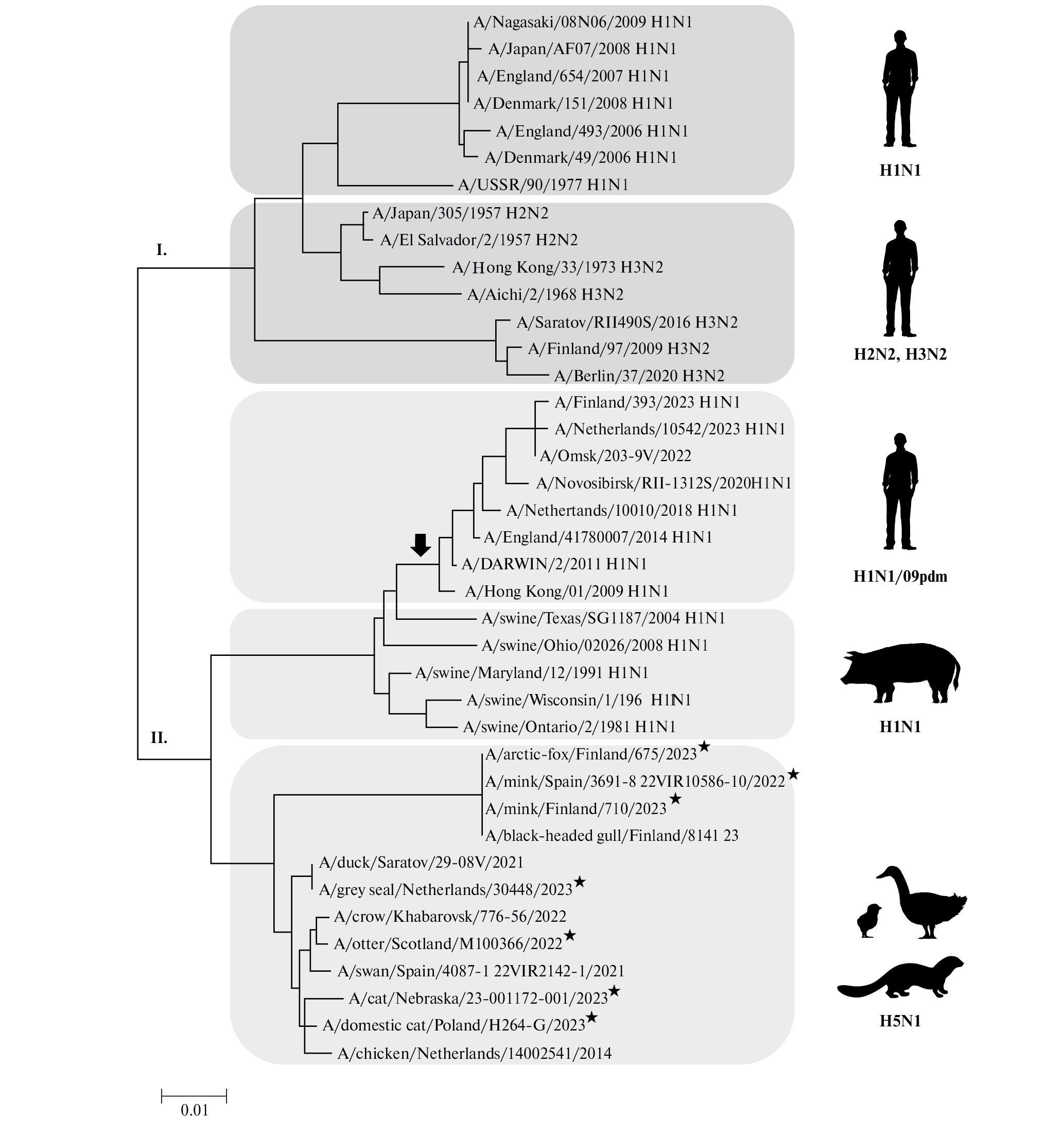 Рис. 1. Филогенетический анализ первичной структуры белка NP вирусов гриппа А птиц и млекопитающих животных, включая человека. Филогенетическое дерево белка NP построено по последовательностям белка NP из базы данных GISAID и GenBank. Исследованы вирусы гриппа А, изолированные от птиц, свиней, норок, кошек и других млекопитающих животных, включая человека, в период 1957–2023 гг. Для анализа применяли программу MEGA-10 (алгоритм ближайшего соседа – NJ). Для построения дерева использованы 39 полных последовательностей а.к. белков NP для вирусов классического гриппа человека H1N1 (1950–2008 гг.), классической линии свиных штаммов H1N1 (1961–2020 гг.), птичьих вирусов субтипа H5N1 (2014–2023 гг.), вирусов H5N1 от млекопитающих (2021–2023 гг.). GenBank: AAA51491.1; AFM72964.1; ABD60794.1; AFM71861.1; ABW36337.1; ACD85158.1; ADM18085.1; AHB51548.1; ADG59708.1; ABI84963.1; APC57870.2; GISAID: EPI243398; EPI173795; EPI168140; EPI171494; EPI168127; EPI677976; EPI138999; EPI2760375; EPI2755515; EPI2755455; EPI2737210; EPI2761157; EPI886274; EPI1922958; EPI1229955; EPI2557220; EPI1248597; EPI2748090; EPI2616223; EPI2603677; EPI1998203; EPI2220590; EPI2158641; EPI2670207; EPI181378; EPI319186; EPI1673272; EPI2587076.