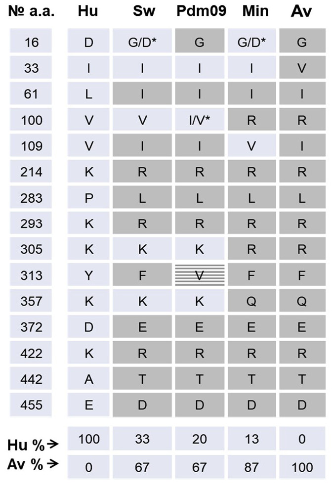 Рис. 2. Сравнение аминокислотных штампов белка NP у вирусов гриппа А, изолированных от млекопитающих и птиц. Номера 15 позиций аминокислот (а.к.), формирующих генетические штампы в белке NP (м.м. 70 кДа; 498 а.к.), характерные для вирусов человека, свиньи и птиц [4, 14], указаны слева на право по порядку от N-концевого метионина. В верхней части столбцов указаны филогенетические клайды вирусов классического гриппа человека H1N1 (Hu), классических свиных вирусов H1N1 (Sw), пандемического вируса гриппа человека H1N1/2009pdm (Pdm09), вирусов гриппа H5N1, изолированных от норок (Min), классической линии вирусов птиц H5N1 (Av). В нижней части по горизонтали приведены значения доли (%) а.к. позиций, совпадающих у данной группы вирусов с птичьими (Av) и человеческими (Hu) генетическими штампами (“genetic signatures”). Позиции а.к. показаны в общепринятом однобуквенном латинском обозначении в формате Logos (http://weblogo.threeplusone.com/). (*) Отмеченные позиции аминокислот имеют гетерогенность в вирусных популяциях, в которых указанная после косой линии аминокислота обнаруживается в 10–20% вирусных изолятов. Для идентификации а.к. вариаций различным фоном показаны позиции аминокислот у вирусов человека (белый фон) и вирусов птиц (серый фон). Горизонтальным штрихом обозначен фон в а.к. позиции 313 NP, которая отличается от таковой у обоих референсных вирусов.
