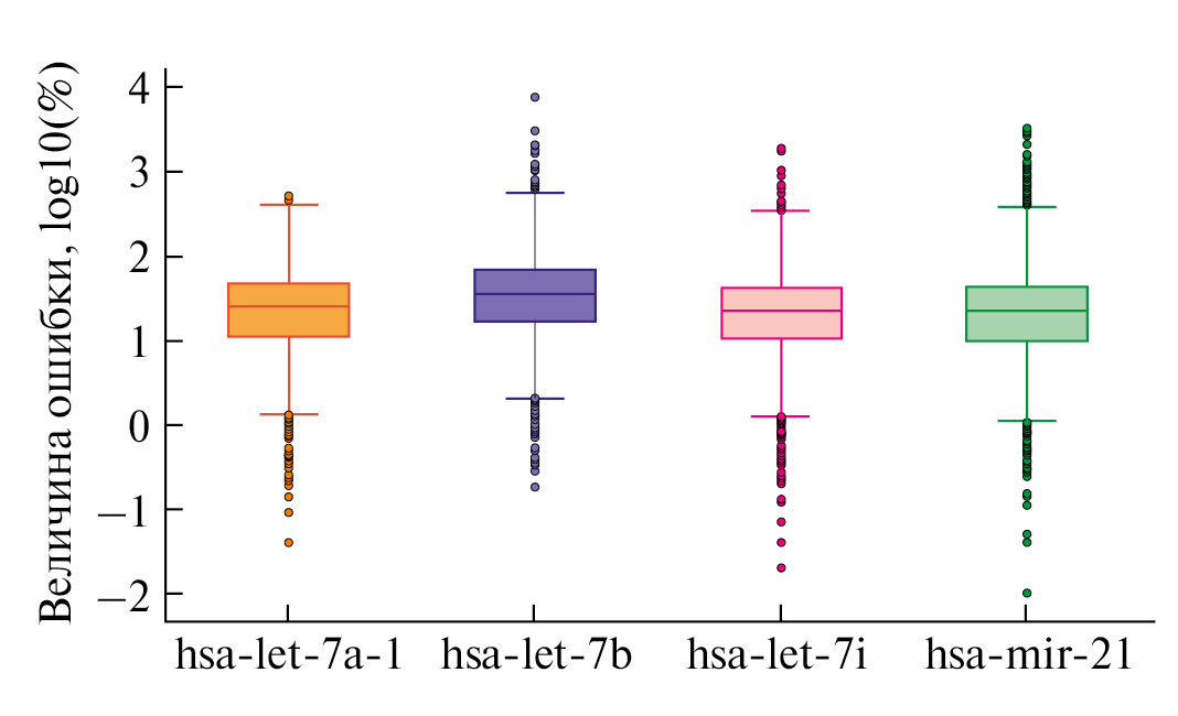 В нашем случае все модели имеют сходные распределения величин ошибки, только в случае микроРНК hsa-let-7b наблюдается чуть более высокий средний процент ошибок: 44.8% против 37.3% для hsa-mir-21 и 29.6% для hsa-let-7i. В нашем случае, однако, более показательным критерием может выступать величина квантиля 0.9 (максимальная ошибка для 90% выборки, ранжированной по возрастанию величины ошибки) ввиду наличия единичных уникальных артефактных образцов, для которых разница между предсказанными и актуальными значениями составляет до 4 порядков. Так, для микроРНК hsa-mir-21 квантиль 0.9 равен 68.4%, для микроРНК hsa-let-7a-1 – 61.7%, для микроРНК hsa-let-7b – 82% и для микроРНК hsa-let-7i – 63.6%. Отдельно отметим, что попытки кластеризовать и охарактеризовать отдельно имеющийся набор данных по типам рака или по сходству уровня экспрессии РНК для снижения величины ошибки принесли обратный эффект, таким образом, наличие максимально разнообразных данных способствует увеличению качества модели, позволяя выявить закономерности, которые отсутствуют или очень слабо выражены в отдельных типах рака.