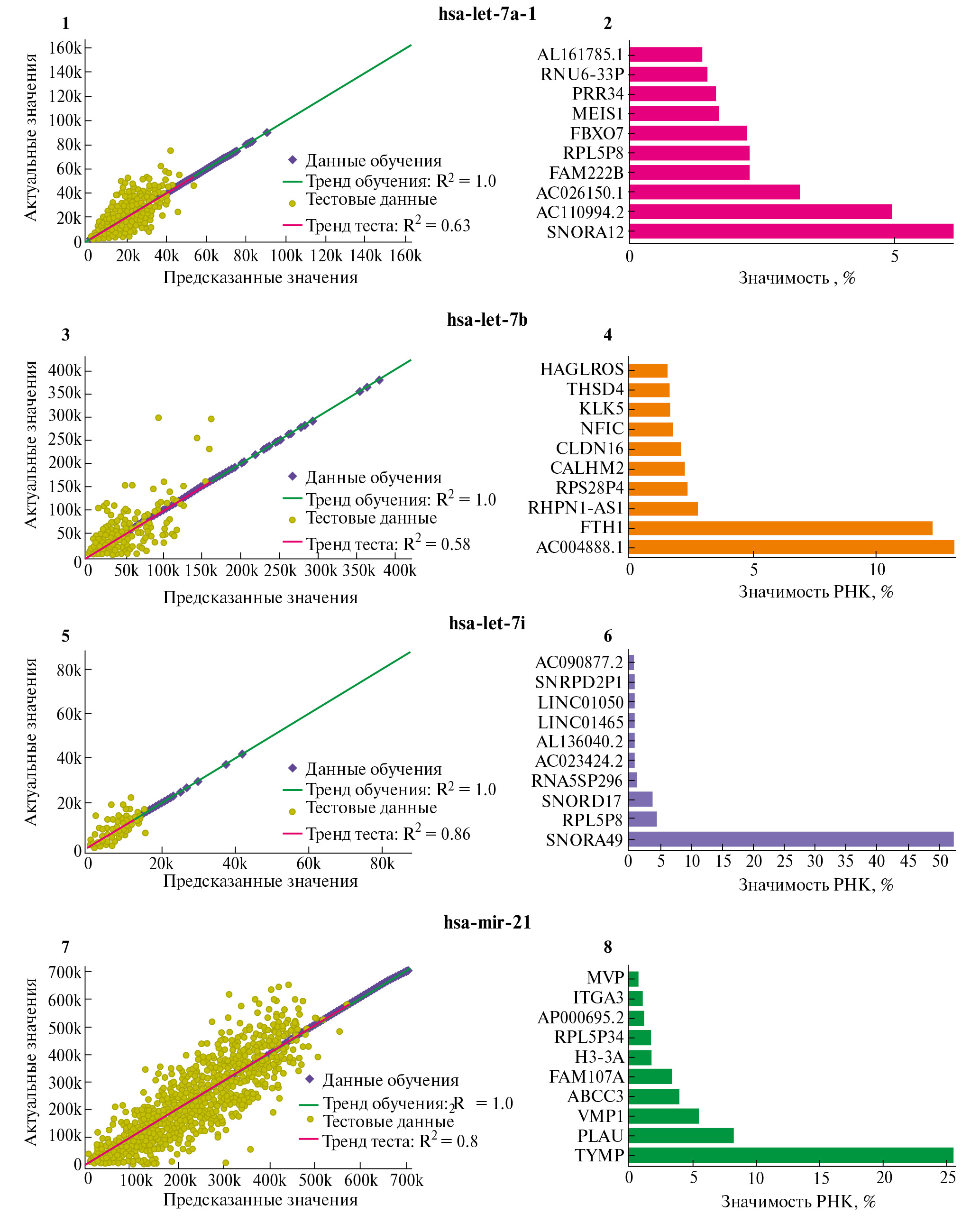 На первом этапе мы оценили качество работы выбранного алгоритма градиентного бустинга для предсказания абсолютных значений уровней экспрессии выбранных микроРНК для тренировочного и тестового набора данных. Оценка включала в себя анализ сонаправленности линий линейной корреляции и значений R2 между актуальными и предсказанными значениями в обучающей и тестовой выборке. Результаты работы моделей для четырех изучаемых микроРНК представлены на рис. 2 (пункты 1, 3, 5, 7). На основании полученных данных можно утверждать, что после оптимизации гиперпараметров каждой модели алгоритм LightGBM Regressor способен уверенно описать основные зависимости для микроРНК hsa-mir-21 (R2 = 0.8) и для микроРНК hsa-let-7i (R2 = 0.86). Для двух других членов семейства микроРНК hsa-let-7 градиентный бустинг показал чуть менее высокое качество оценки результатов на тестовом наборе данных: R2 = 0.63 для hsa-let-7а-1 и R2 = 0.58 для hsa-let-7b соответственно. Важно отметить, что во всех моделях наблюдается крайне высокая сонаправленность между графиками линейных корреляций для тренировочных и тестовых значений, что говорит об отсутствии значимых не охарактеризованных зависимостей в тренировочных наборах относительно тестового множества. Также следует подчеркнуть важность подбора оптимальных гиперпараметров. Так, в частности, важность оптимизации числа деревьев и числа “листьев”, особенно в случае микроРНК hsa-let-7а-1 и hsa-let-7b, – недостаточное число деревьев быстро приводило к значительному падению качества оценки тестового набора данных. Напротив, избыточное число деревьев решений и значительное число “листьев” несколько ухудшало прогноз за счет переобучения алгоритма, что было особенно заметно на кросс-валидационных тестах, в которых модели одинаковой архитектуры обучались на разных наборах тренировочных и тестовых данных.