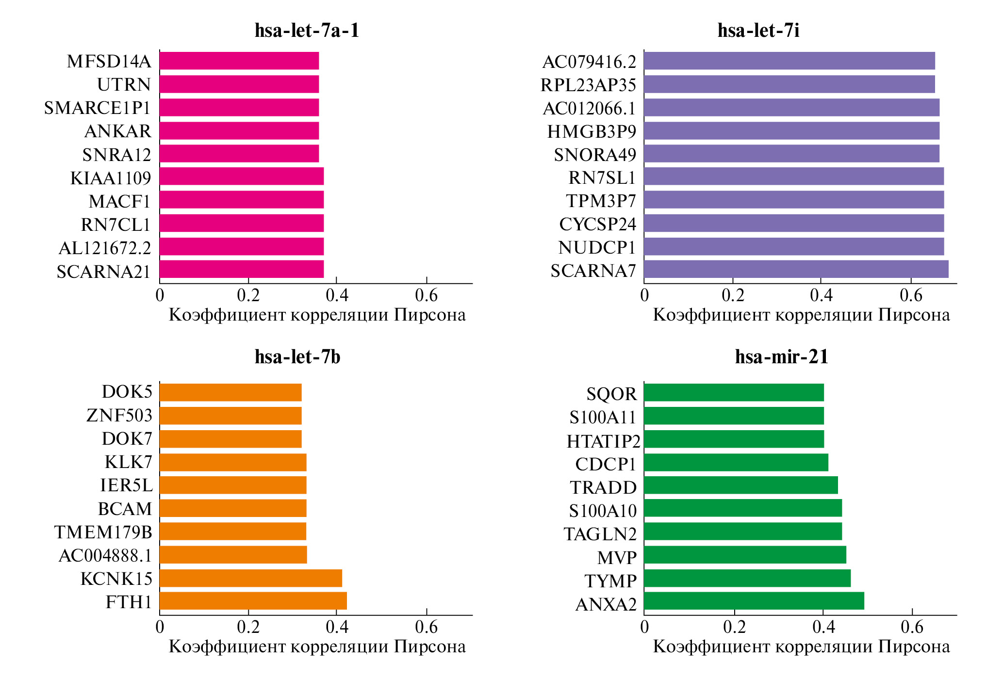 Рис. 3. Соотношение 10 РНК, имеющих наибольшие абсолютные значения коэффициентов корреляции Пирсона, с целевыми микроРНК.