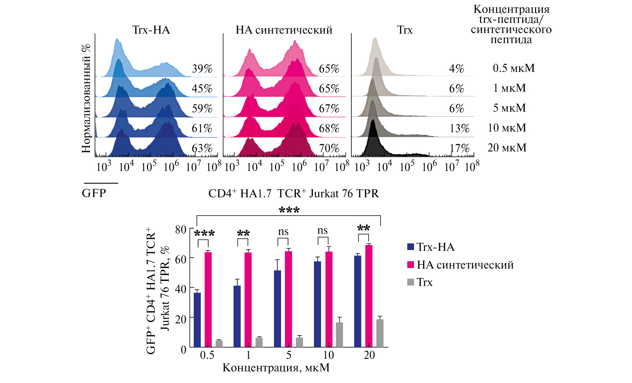 CD4+ HA1.7 TCR+ клетки Jurkat 76 TPR (100 000 клеток на лунку) инкубировали совместно с CD80+ HLA-DRB1*01:01+ клеточной линией HeLa (10 000 клеток на лунку) с различными концентрациями rx-HA (0.5, 1, 5, 10 и 20 мкМ) в течение 16 часов в 96-луночном круглодонном планшете (рис. 2). Синтетический пептид HA306–318 (PKYVKQNTLKLAT) служил положительным контролем. Повышение концентрации носителя trx приводило к активации клеток CD4+ HA1.7 TCR+ Jurkat 76 TPR. Однако процент клеток GFP+ CD4+ HA1.7 TCR+ Jurkat 76 TPR, инкубированных с 20 мкМ носителя trx, был статистически ниже, чем наблюдавшийся при инкубации с 0.5 мкМ trx-HA (p < 0.001). Несмотря на то, что синтетический пептид HA демонстрировал более высокий потенциал активации клеток CD4+ HA1.7 TCR+ Jurkat 76 TPR по сравнению с trx-HA, инкубация при концентрациях 5 и 10 мкМ не показала статистически значимой разницы между trx-пептидом и синтетическим пептидом.