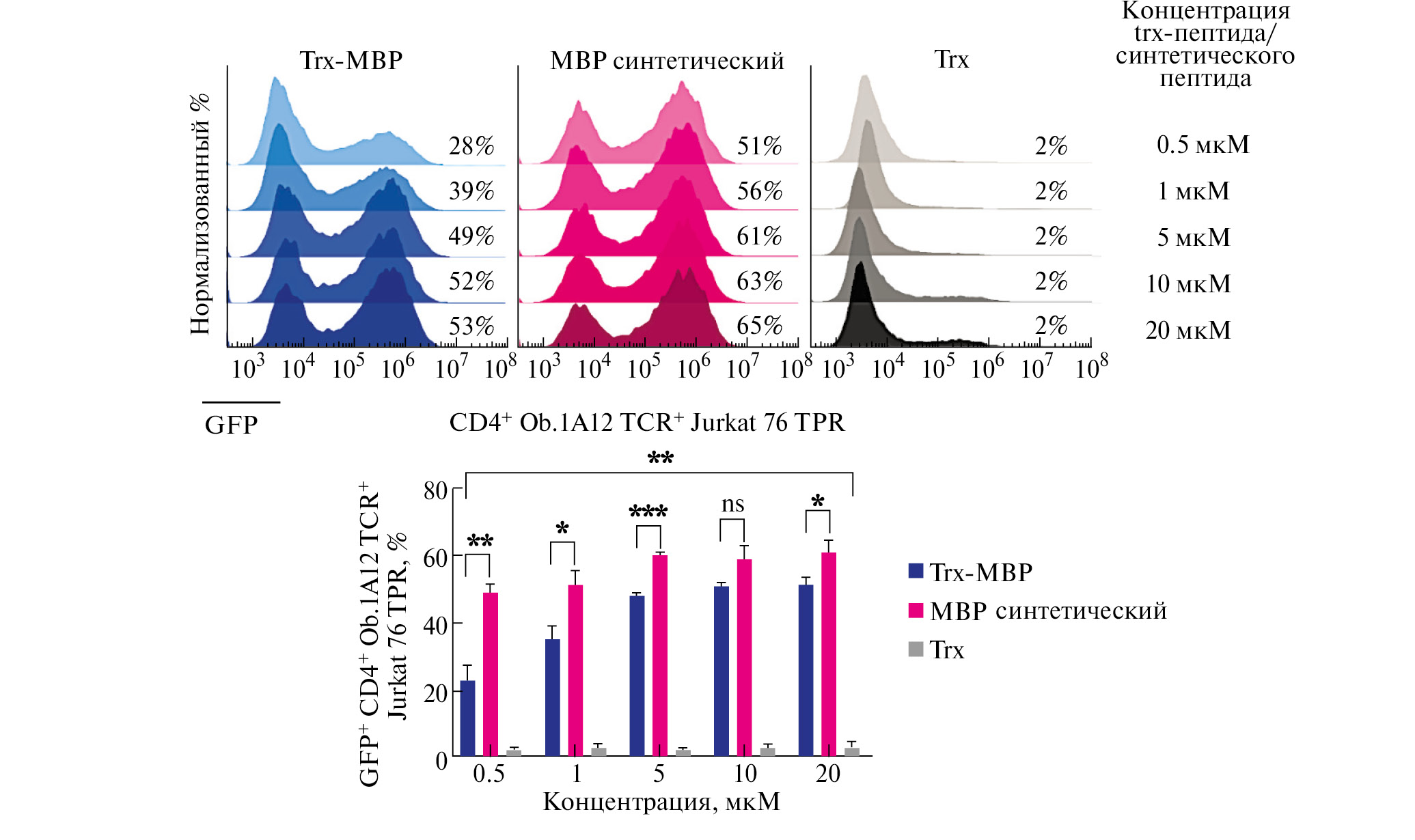 Рис. 3. Стимуляция CD4+ Ob.1A12 TCR+ Jurkat 76 TPR клетками CD80+ HLA-DRB1*15:01+ HeLa, праймированными эпитопами MHC-II. Клетки CD4+ Ob.1A12 TCR+ Jurkat 76 TPR инкубировали с CD80+ HLA-DRB1*15:01+ HeLa в течение 16 часов с синтетическим пептидом MBP или trx-MBP в концентрации 0.5, 1, 5, 10 и 20 мкМ. Носитель trx использовали в качестве отрицательного контроля. Анализ проводили с помощью проточной цитометрии. Значения указывают процент активированных клеток, экспрессирующих GFP. Показаны репрезентативные профили проточной цитометрии. Процент GFP-положительных клеточных линий CD4+ Ob.1A12 TCR+ Jurkat 76 TPR, инкубированных с CD80+ HLA-DRB1*15:01+ HeLa, загруженными синтетическим пептидом MBP или trx-MBP в концентрации 0.5, 1, 5, 10 и 20 мкМ, показан как среднее ± стандартное отклонение трех экспериментальных повторов (нижний рисунок). Статистический анализ проводился с использованием t-критерия Уэлча: * – p < 0.05, ** – p < 0.01, *** – p < 0.001.