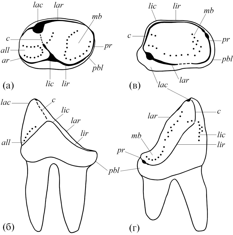 Передняя сторона P3 узкая. В основании передней стороны лингвального бугорка имеется узкий, но четкий полкообразный антеролингвальный выступ, медиально ограниченный килевидным передним гребнем, а латерально – передним выступом лабиального бугорка (рис. 2а, 2б). Лабиальный бугорок конический, с довольно крутым задним склоном (рис. 2в, 2г). Лингвальный бугорок сжат продольно. Задний базальный выступ сужается к дистальному краю. Корни относительно длинные, широко расставленные, расходящиеся; изогнутый передний корень немного длиннее, но тоньше заднего.