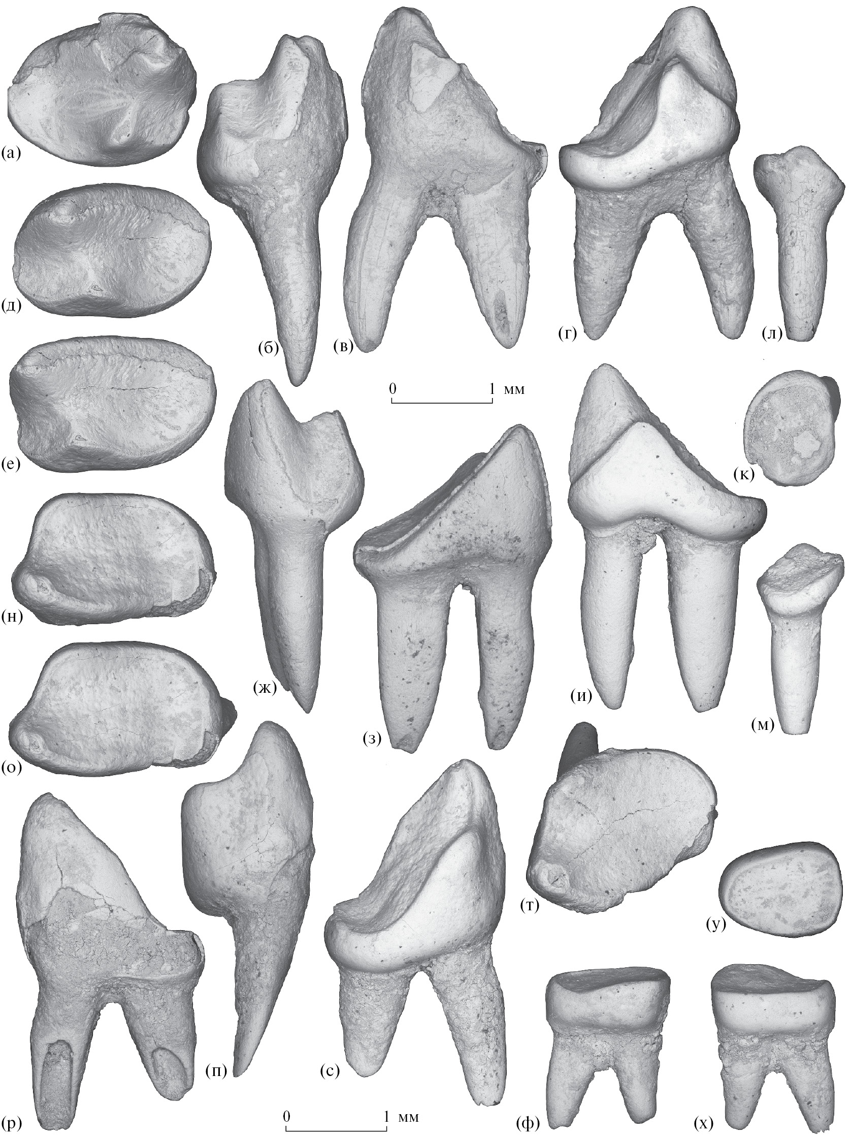 Рис. 2. Cynopterus brachyotis (Müller, 1838): а–г – экз. ПИН, № 5826/570, правый P3: а – с окклюзиальной стороны, б – с передней стороны, в – с лабиальной стороны, г – с лингвальной стороны; д–и – экз. ПИН, № 5826/571, левый P4: д – с окклюзиальной стороны, е – с окклюзиальной стороны с мезиальным наклоном, ж – с передней стороны, з – с лабиальной стороны, и – с лингвальной стороны; к–м – экз. ПИН, № 5826/572, левый P1: к – с окклюзиальной стороны, л – с лабиальной стороны, м – с лингвальной стороны; н–с – экз. ПИН, № 5826/573, левый P3: н – с окклюзиальной стороны, о – с окклюзиальной стороны с мезиальным наклоном, п – с передней стороны, р – с лабиальной стороны, с – с лингвальной стороны; т – экз. ПИН, № 5826/574, левый P3 с окклюзиальной стороны; у–х – экз. ПИН, № 5826/505, правый M2: у – с окклюзиальной стороны, ф – с лабиальной стороны, х – с лингвальной стороны; Вьетнам, провинция Лангшон, пещера Там-Хай; средний плейстоцен.
