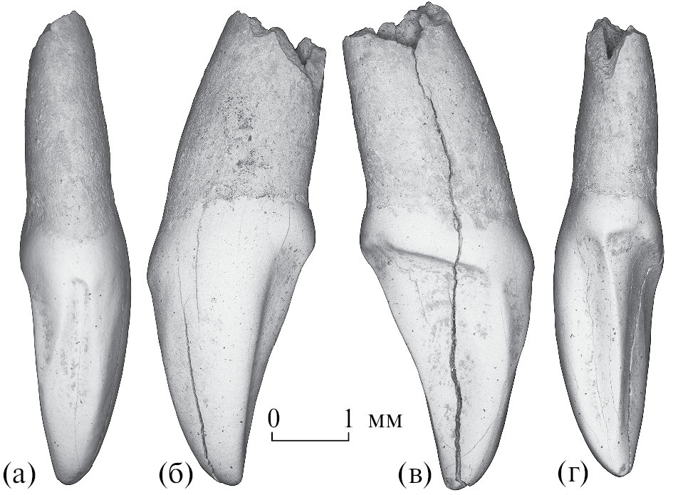 Рис. 3. Rousettus leschenaultii (Desmarest, 1820), экз. ПИН, № 5826/563, левый C1: а – с передней стороны, б – с лабиальной стороны, в – с лингвальной стороны, г – с задней стороны; Вьетнам, провинция Лангшон, пещера Там-Хай; средний плейстоцен.