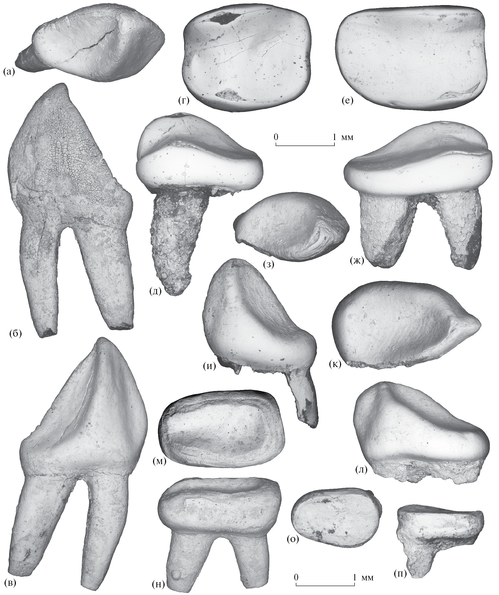Рис. 4. Rousettus leschenaultii (Desmarest, 1820): а–в – экз. ПИН, № 5826/822, правый P3: а – с окклюзиальной стороны, б – с лабиальной стороны, в – с лингвальной стороны; г, д – экз. ПИН, № 5826/615, левый P4: г – с окклюзиальной стороны, д – с лингвальной стороны; е, ж – экз. ПИН, № 5826/584, правый M1: е – с окклюзиальной стороны, ж – с лингвальной стороны; з, и – экз. ПИН, № 5826/564, правый P3: з – с окклюзиальной стороны, и – с лингвальной стороны; к, л – экз. ПИН, № 5826/508, правый P4: к – с окклюзиальной стороны, л – с лингвальной стороны; м, н – экз. ПИН, № 5826/597, левый M2: м – с окклюзиальной стороны, н – с лингвальной стороны; о, п – экз. ПИН, № 5826/568, правый M3: о – с окклюзиальной стороны, п – с лингвальной стороны; Вьетнам, провинция Лангшон, пещера Там-Хай; средний плейстоцен.