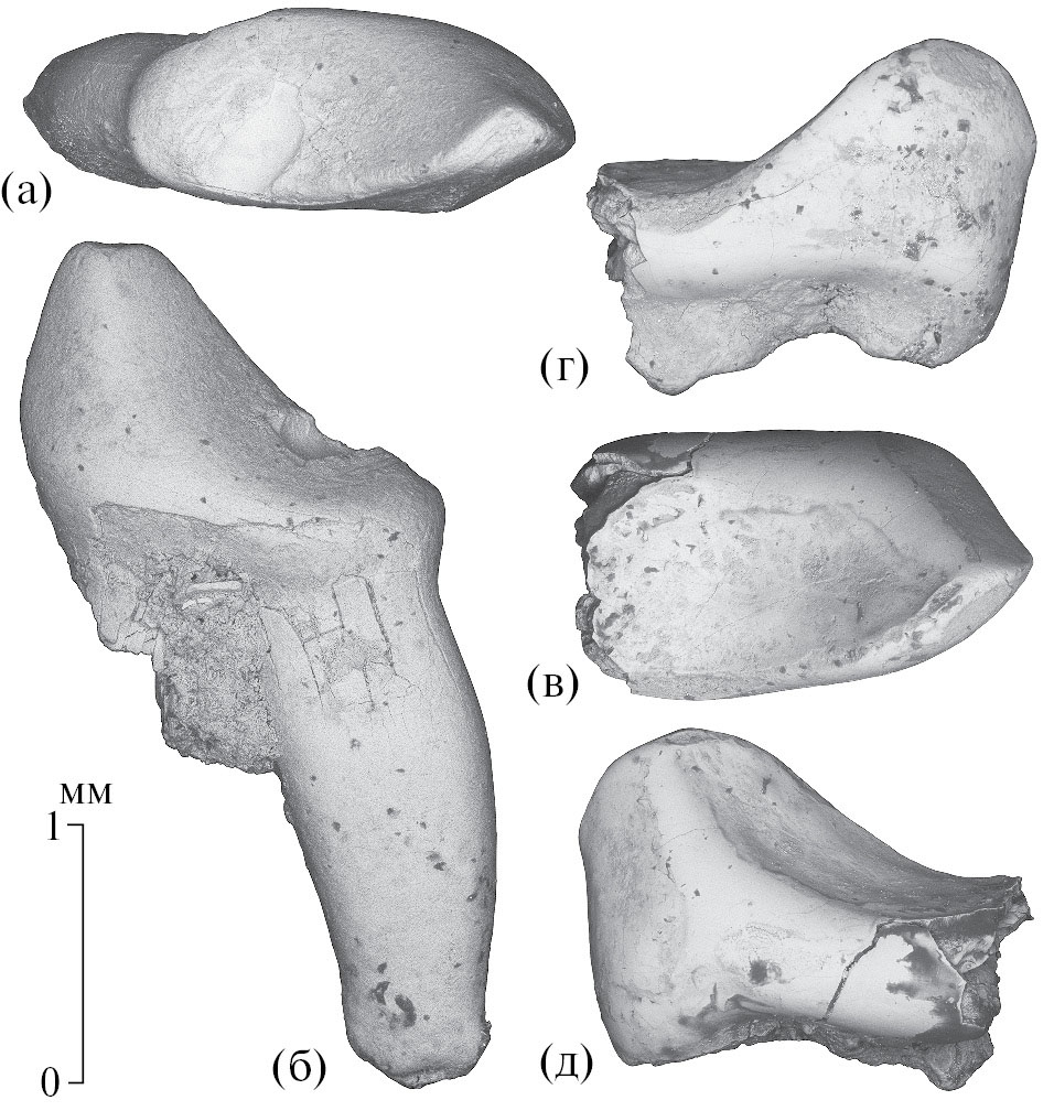 Рис. 5. Eonycteris spelaea (Dobson, 1871): а, б – экз. ПИН, № 5826/593, правый P3: а – с окклюзиальной стороны, б – с лингвальной стороны; в–д – экз. ПИН, № 5826/577, правый P4: в – с окклюзиальной стороны, г – с лабиальной стороны, д – с лингвальной стороны; Вьетнам, провинция Лангшон, пещера Там-Хай; средний плейстоцен.