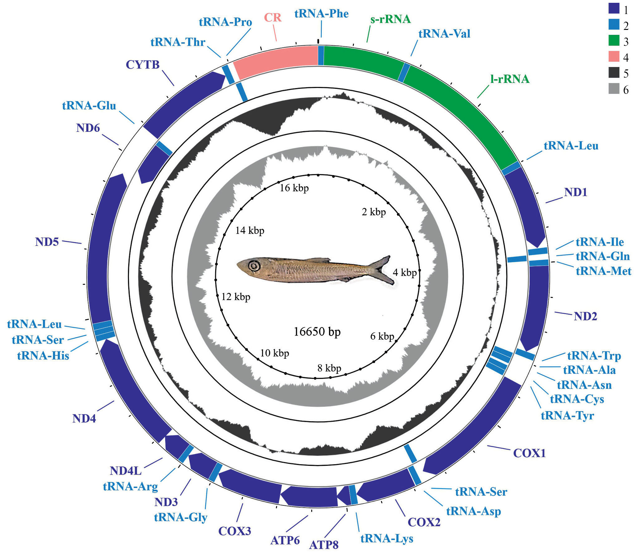 Рис. 1. Круговая карта митохондриального генома Clupeonella abrau (озеро Абрау). Внешний круг указывает на расположение и распределение генов в митогеноме. Гены, кодируемые H (+) цепью и L (–) цепью, отображены во внешнем и внутреннем кольцах соответственно. Условные обозначения: 1 – белок-кодирующие гены; 2 – транспортная РНК; 3 – рибосомальная РНК; 4 – контрольный регион; 5 – содержание нуклеотидов G и C в молекуле ДНК (GC-content), средняя линия соответствует значению 0.5; 6 – неравномерность распределения нуклеотидов G+C в молекуле ДНК (GC-skew), средняя линия соответствует значению 0.