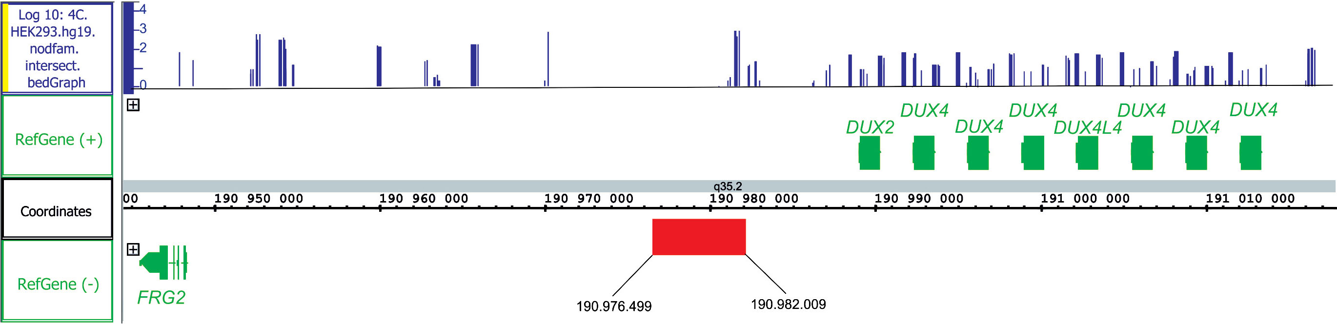 Рис. 1. Физическая карта субтеломерной области chr4 и места контактов генов рРНК, выявленные с помощью метода 4С в линии клеток HEK293T (координаты в геномном браузере IGB приведены для версии генома человека hg19). Синим показаны места контактов генов рРНК. Зеленым указаны гены DUX. Красный прямоугольник указывает область ДНК длиной 5511 bp, которая была наработана с помощью long PCR и использована для FISH.
