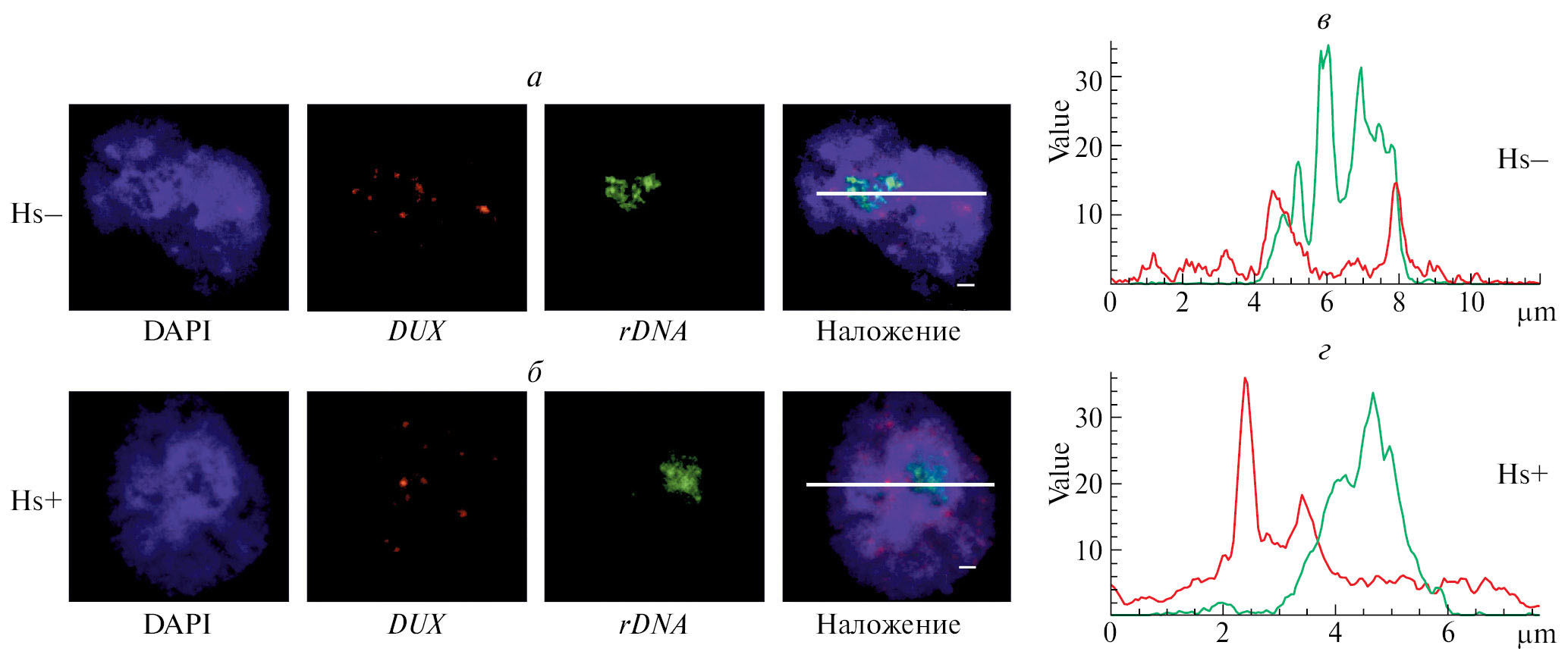 На рис. 2 представлены результаты FISH. Оказалось, что имеется около 10 фокусов гибридизации DUX, что было ожидаемым, т.к. амплифицированный фрагмент является повтором, связанным с генами DUX, и по данным BLAST – Genome (GRCh38.p14 reference assembly RS_2023_10) представлен в хромосомах 3, 4, 10, 12–15, 21, 22, и в нескольких еще нелокализованных областях генома человека. Известно, что в хромосомах 4 и 10 в кластере генов DUX имеется от 8 до 100 копий [14, 15]. Видно, что имеются гены DUX, которые расположены вокруг ядрышка (рис. 2а). Кластеры генов рРНК в клетках HEK293T представлены в виде одного ядрышка. Профили сигналов DUX и rDNA позволили выявить, что в исходных клетках гены DUX расположены непосредственно по краям области ядрышка (рис. 2в). После теплового шока они немного – до 2.5 μm – удаляются от ядрышка (рис. 2г).
