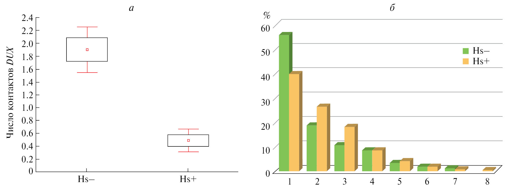 Рис. 3. Диаграммы, показывающие число фокусов гибридизации зонда DUX, приходящееся на одно ядро в исходных клетках и в клетках после теплового шока (a) и % фокусов гибридизации пробы DUX в ядрах по мере удаления от центра ядрышка (б). HS – – эксперименты с исходными клетками. HS+ – эксперименты с клетками после теплового шока. Для анализа использовали по 100 клеток. p-value < 0.05.