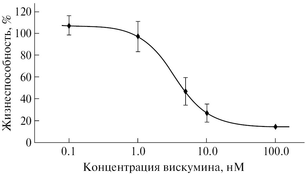 Рис. 1. Кривая жизнеспособности макрофагов М1 при обработке клеток вискумином. Точки на графике представляют среднее значение жизнеспособности по трем биологическим повторам. В качестве планок погрешностей использовали стандартную ошибку среднего. Макрофаги М1, полученные из клеточной линии ТНР-1, обрабатывали указанными концентрациями вискумина в течение 6 ч с последующей отмывкой и 24-ч инкубацией в культуральной среде.