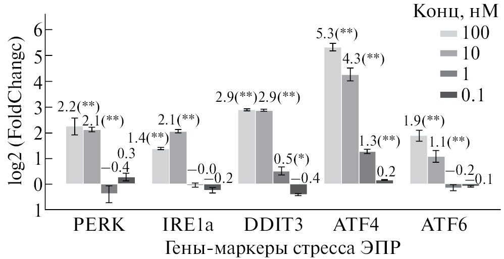 Рис. 2. Оценка индукции стресса ЭПР методом ОТ-кПЦР. Изменение экспрессии log2(FC) в обработанных вискумином макрофагах М1 в диапазоне концентраций 0.1 – 100 нМ оценивали относительно контрольных необработанных макрофагов М1 по методу ΔΔCt [20]. Статистическую значимость оценивали с помощью t-теста Стьюдента с поправкой на множественность методом Бенджамини-Хохберга (** – p-adjusted < 0.005, * – p-adjusted < 0.05). В качестве референсных генов использовали ACTB, GAPDH. Планки погрешностей показывают стандартную ошибку среднего по трем биологическим повторам. Поляризованные макрофаги М1 обрабатывали указанными концентрациями вискумина в течение 6 ч с последующей инкубацией в среде без вискумина в течение 24 ч.