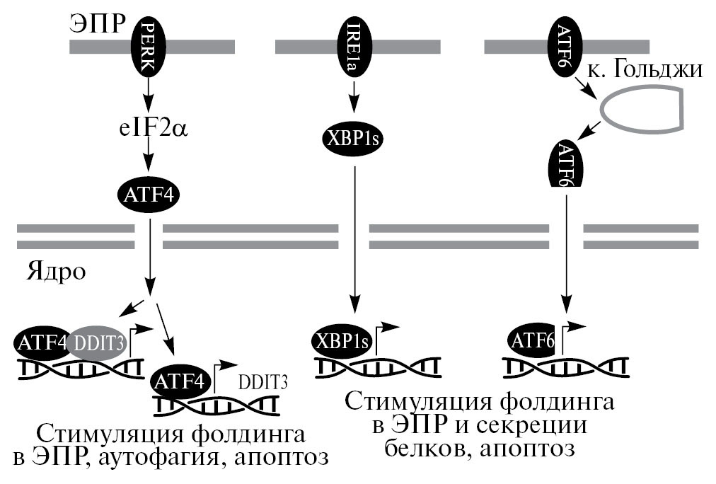 Рис. 3. Схема сигнального пути UPR, индуцируемого стрессом ЭПР. Показаны три каскада UPR, активируемые сенсорами PERK, IRE1a и ATF6.