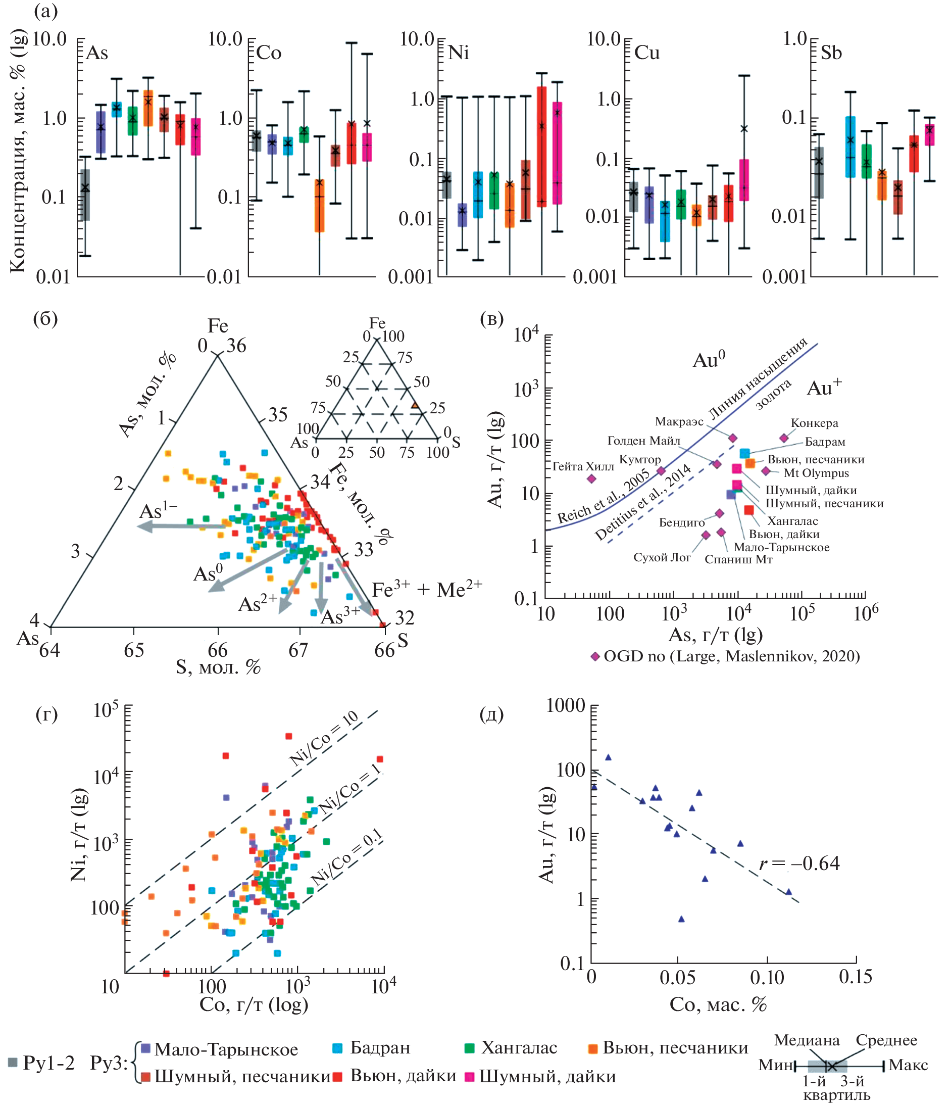 - Deditius A.P., Reich M., Kesler S.E., Utsunomiya S., Chryssoulis S.L., Walshe J., Ewing R.C. The coupled geochemistry of Au and As in pyrite from hydrothermal ore deposits // Geochimica et Cosmochimica Acta. 2014. V. 140. P. 644–670.