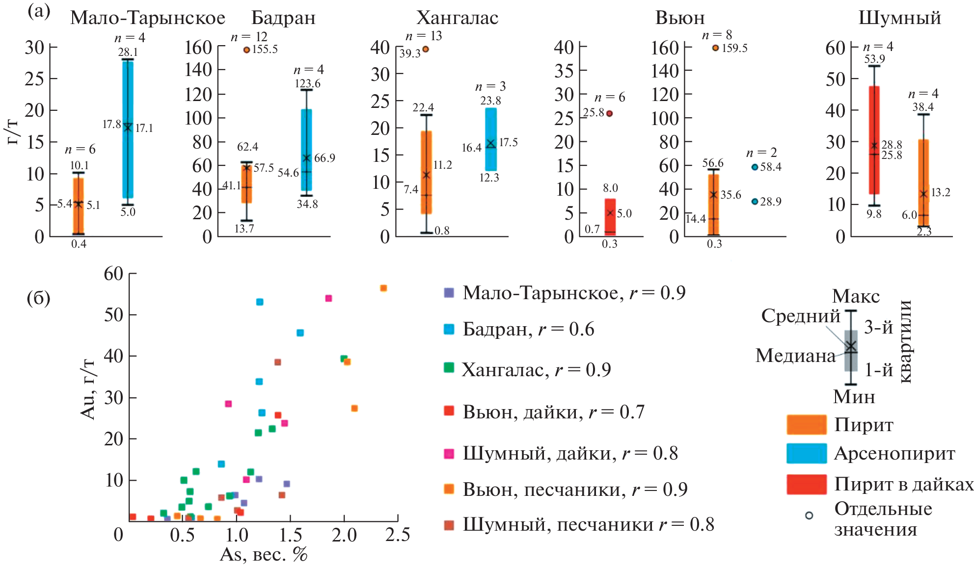 - Kudrin M.V., Fridovsky V.Y., Polufuntikova L.I., Kryuchkova L. Disseminated Gold–Sulfide Mineralization in Metasomatites of the Khangalas Deposit, Yana–Kolyma Metallogenic Belt (Northeast Russia): Analysis of the Texture, Geochemistry, and S Isotopic Composition of Pyrite and Arsenopyrite // Minerals. 2021. V. 11. №. 4. P. 403.