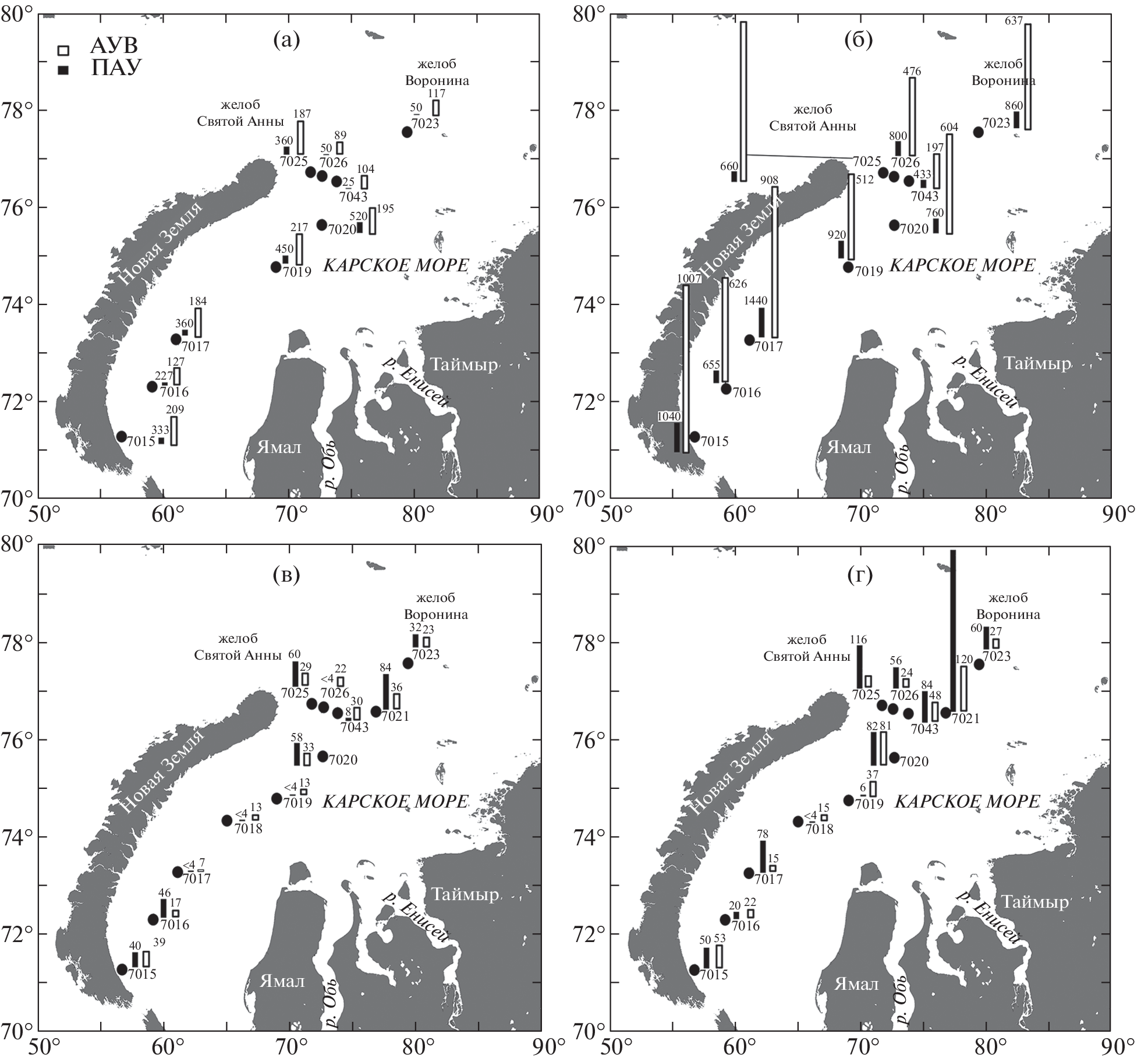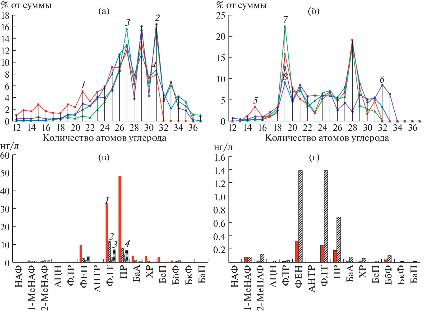 Concentrations and composition of hydrocarbons – HCs (aliphatic – AHCs and polycyclic aromatic hydrocarbons – PAHs) in the Kara Sea (cruise 83 of the R/V Academic Mstislav Keldysh, June 2021) in the sea surface microlayer – SML (about 300 µm thick), ice and surface waters weree defined. The concentration of AHCs in SML occurs in suspended particulate matter (SPM), where their content varied in the range of 197–1051 µg/l, on average 621 and was almost 4 times higher than in the dissolved form: 89–270, on average 158 µg/l, and according to compared with the suspended form of surface waters – almost 22 times higher (on average 33 µg/l). The accumulation of organic compounds also occurs in ice, but to a lesser extent than in the SML. According to the composition of alkanes, the influence of autochthonous processes on the formation of AHCs in surface microlayer and melting ice is mostly insignificant, and this distinguishes their behavior from the ice that forms. The content of PAHs in surface microlayer in SPM was also 4.8 times higher on average than in the dissolved form. Despite the different sources of these hydrocarbon classes, for all samples taken, a dependence was observed in the distribution of AHCs and PAHs in SPM (r = 0.79, n = 52, at p < 0.01). In the composition of PAHs, according to the markers, the influence of combustion products of marine fuel is traced, since, in addition to phenanthrene, fluoranthene and pyrene dominated in all samples.