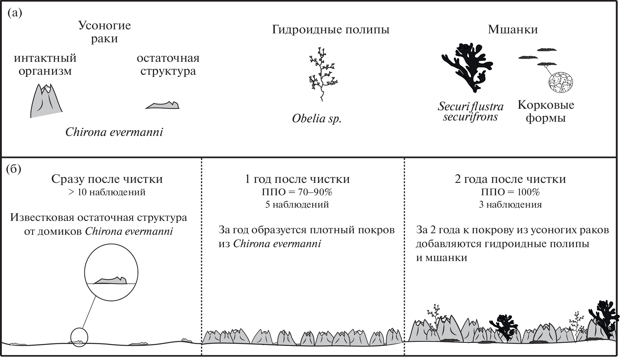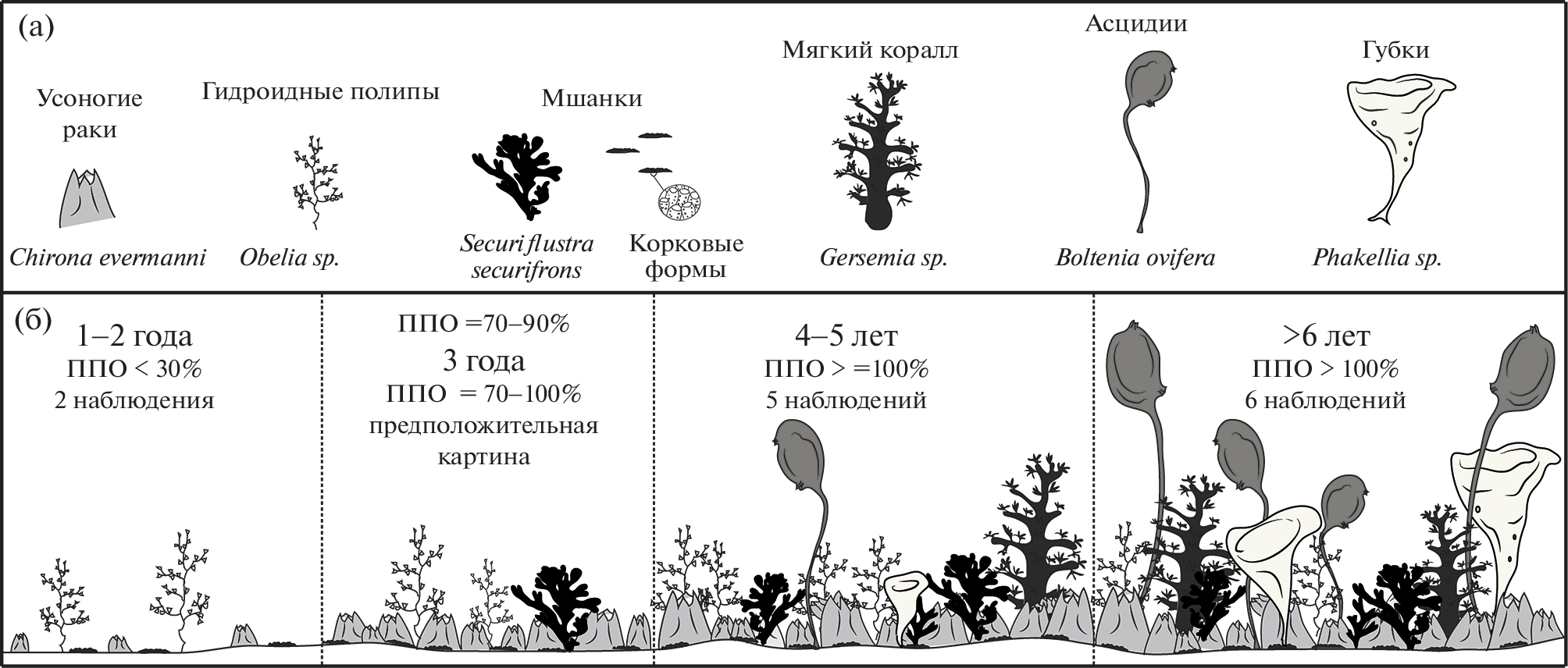 А 10-year succession of the fouling community inhabiting underwater manmade structures at a depth of 80–90 m was described using the materials from regular video surveys of the technical installations on the southwestern shelf of the Sea of Okhotsk. A general scheme of macrofouling community developmental stages in steps of 1–2 years has been compiled both for the intact community and for sites subjected to the single or multiple hydrodynamic cleaning. For each stage we visually estimated the projective cover of macrofouling and identified the characteristic dominant species down to the smallest possible taxon. The first two years of the intact community are characterized by low projective cover (up to 50%), in the third year and further there is a sharp increase in the abundance and diversity of macrofouling organisms. Barnacles Chirona evermanni, sponges Phakellia sp., bryozoans Securiflustra securifrons, and ascidians Boltenia ovifera were noted among the dominant species in the community older than two years. The early stages of restorative succession differ from the intact succession in terms of dominant species and developmental rates.