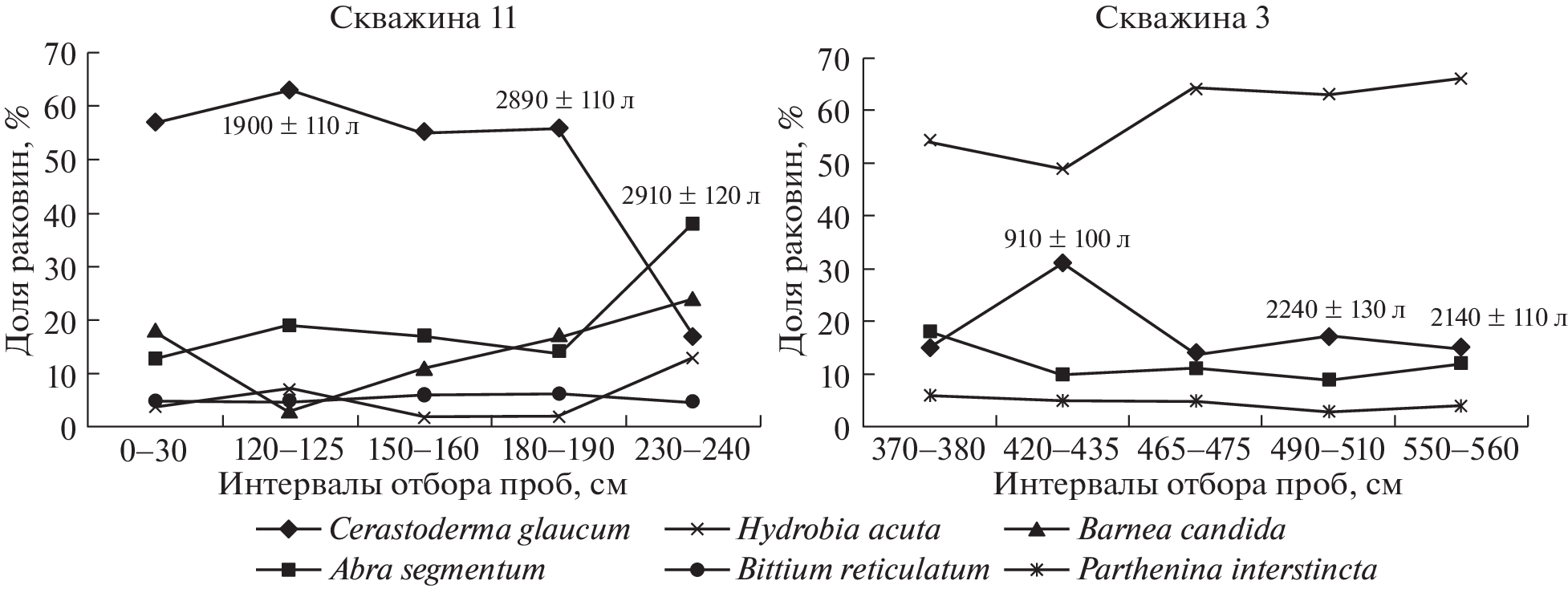The study and analysis of malacofauna from cores of bottom sediments and cores from the Azov spits showed the nature of the change during the transition from the Ancient Azovian to the New Azovian layers, the uneven distribution of communities in time and space. The shell material from littoral malacocenosis and shallow-water banks is the main component for the formation of spits. Based on a series of cores up to 25 m thick from the Dolgaya Spit, it is shown that its formation began about 2500 years ago, and carbonate material reflects the history of the development of the benthic fauna of the sea.