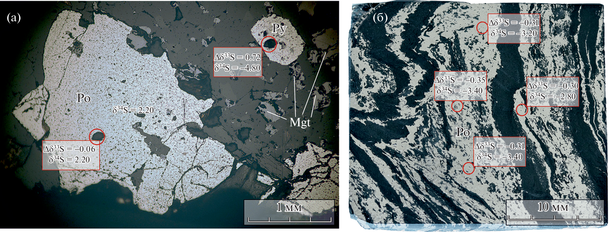 In this paper we provide primary data on multi-isotope sulfur composition of the Neoarchean BIF sulfides of the Kostomuksha greenstone belt in Karelia (the Karelian Craton on Fennoscandian Shield). These sulfides formed at 2760–2740 Ma. Pyrite associated with fine-grained magnetite showed negative δ34S values (up to –7.8‰) and positive Δ33S values (up to +0.7‰). At the same time, pyrrhotite of vein-disseminated ores associated with shale demonstrated both negative δ34S (up to –6‰), and Δ33S values (up to –0.46‰). Based on the obtained data we assume that sulfur for the BIF sulfides was transported from three reservoirs: - atmospheric (photolytic), hydrospheric (seawater sulfate), and magmatogenic. Sulfur isotope ratios in sulfides preserved the evidence of interaction between abiological (atmospheric, hydrothermal) and biological processes (dissimilatory microbial reduction) that occurred during the formation of iron ore deposits of the Kostomuksha greenstone belt in Karelia.