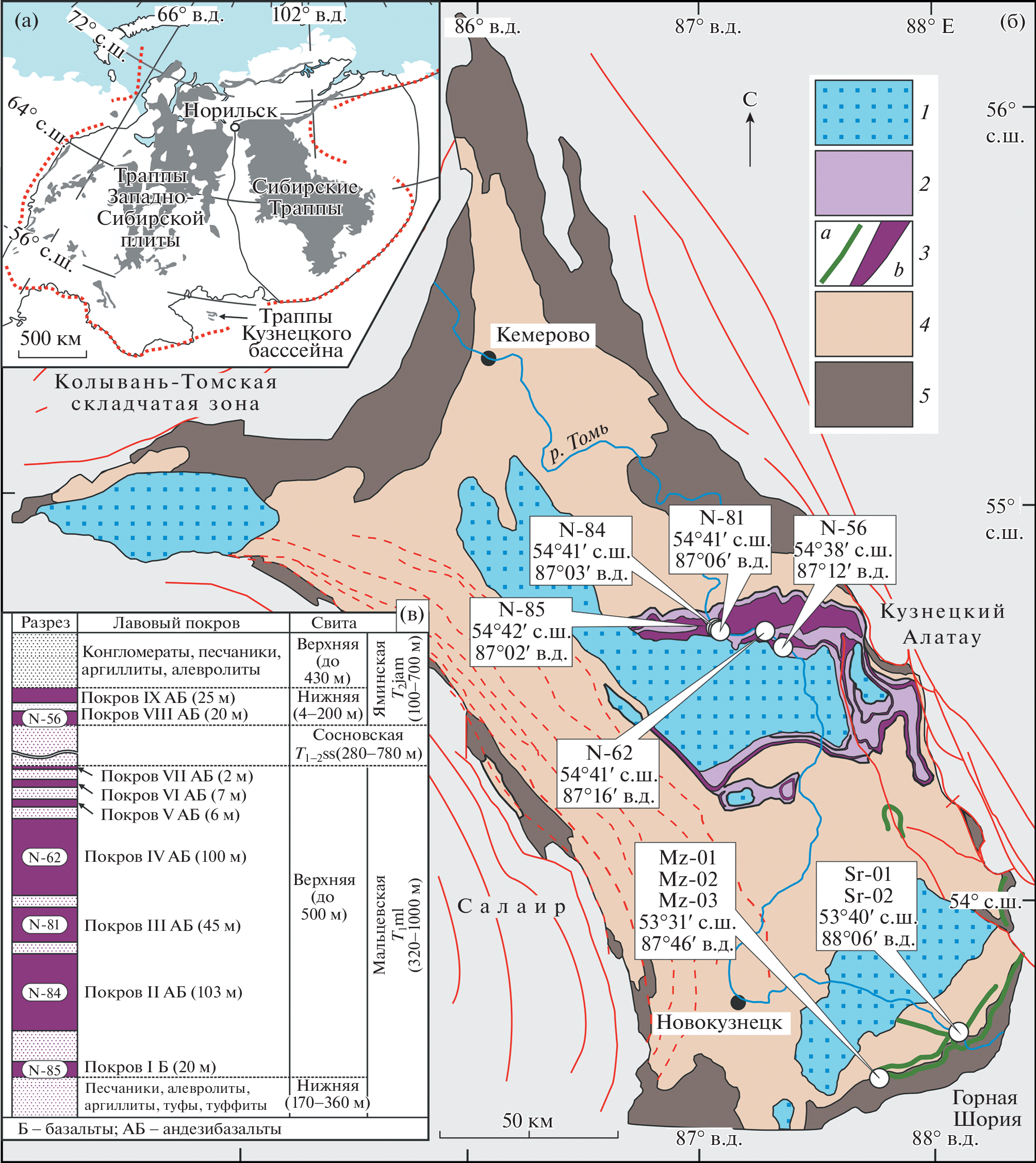 The study provides whole-rock geochemical and Rb-Sr and Sm-Nd isotope examinations of Permian-Triassic volcanics (basalts, basaltic andesites) and sills (trachydolerites, monzodiorites) from the Kuznetsk Basin, which is part of the Siberian Large Igneous Province. It is shown that the volcanic section of the Kuznetsk Basin consists of the Lower (I and II units: TiO2 = 1.6–1.9 wt.%, Gd/Yb = 2.0–2.1) and Upper (III–VIII units: TiO2 = 1.4–1.8 wt.%, Gd/Yb = 1.7–1.9) Sequences. The Mayzass sill is geochemically correlated with the Unit II basaltic andesite of the Lower Sequence, and the Syrkashev sill is geochemically akin to the Upper Sequence. The Kuznetsk traps originated from the partial melting of a Sr-Nd isotopically heterogeneous subduction-modified lithospheric mantle. They are geochemically comparable to low-Ti basalts of the low–middle Nadezhdinsky suite from the Noril’sk region, but differ in Sr-Nd isotope composition. The Sr-Nd isotope signatures of the uncontaminated lavas and Syrkashev sill rocks (εNd(T) = (+4.6)–(+2.4), (87Sr/86Sr)T = 0.7047–0.7054) are inherited from the ancient lithospheric mantle and do not represent the contribution of the Siberian plume. The Mayzass sill rocks (εNd(T) = (+2.2)–(+2.1); (87Sr/86Sr)T = 0.7055–0.7063)are derived from a parental melt contaminated with crustal carbonates.